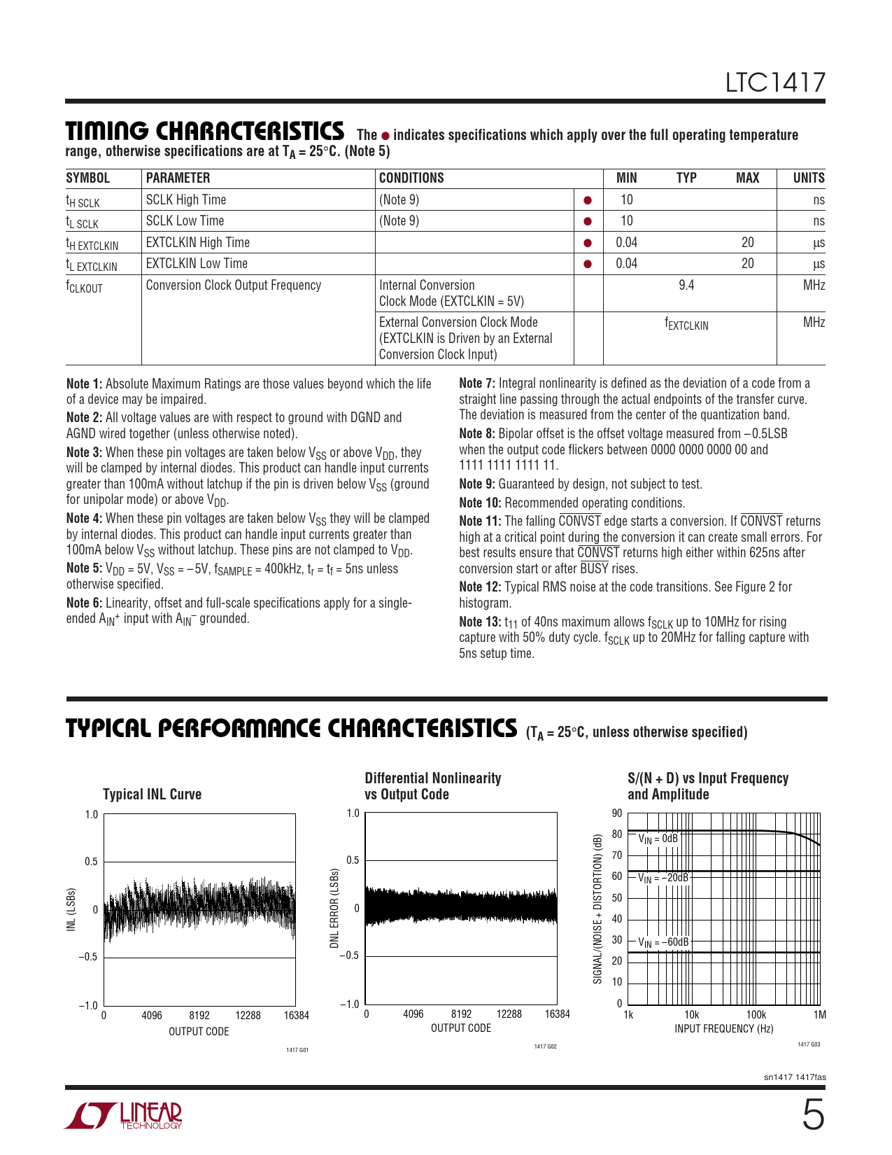 LTC1417 W UTI I G CHARACTERISTICS The ● indicates specifications which apply over the full operating temperature range, otherwise specifications are at TA = 25 ° C. (Note 5)SYMBOLPARAMETERCONDITIONSMINTYPMAXUNITS tH SCLK SCLK High Time (Note 9) ● 10 ns tL SCLK SCLK Low Time (Note 9) ● 10 ns tH EXTCLKIN EXTCLKIN High Time ● 0.04 20 µs tL EXTCLKIN EXTCLKIN Low Time ● 0.04 20 µs fCLKOUT Conversion Clock Output Frequency Internal Conversion 9.4 MHz Clock Mode (EXTCLKIN = 5V) External Conversion Clock Mode fEXTCLKIN MHz (EXTCLKIN is Driven by an External Conversion Clock Input) Note 1: Absolute Maximum Ratings are those values beyond which the life Note 7: Integral nonlinearity is defined as the deviation of a code from a of a device may be impaired. straight line passing through the actual endpoints of the transfer curve. Note 2: All voltage values are with respect to ground with DGND and The deviation is measured from the center of the quantization band. AGND wired together (unless otherwise noted). Note 8: Bipolar offset is the offset voltage measured from – 0.5LSB Note 3: When these pin voltages are taken below V when the output code flickers between 0000 0000 0000 00 and SS or above VDD, they will be clamped by internal diodes. This product can handle input currents 1111 1111 1111 11. greater than 100mA without latchup if the pin is driven below VSS (ground Note 9: Guaranteed by design, not subject to test. for unipolar mode) or above VDD. Note 10: Recommended operating conditions. Note 4: When these pin voltages are taken below VSS they will be clamped Note 11: The falling CONVST edge starts a conversion. If CONVST returns by internal diodes. This product can handle input currents greater than high at a critical point during the conversion it can create small errors. For 100mA below VSS without latchup. These pins are not clamped to VDD. best results ensure that CONVST returns high either within 625ns after Note 5: VDD = 5V, VSS = – 5V, fSAMPLE = 400kHz, tr = tf = 5ns unless conversion start or after BUSY rises. otherwise specified. Note 12: Typical RMS noise at the code transitions. See Figure 2 for Note 6: Linearity, offset and full-scale specifications apply for a single- histogram. ended A + – IN input with AIN grounded. Note 13: t11 of 40ns maximum allows fSCLK up to 10MHz for rising capture with 50% duty cycle. fSCLK up to 20MHz for falling capture with 5ns setup time. WUTYPICAL PERFOR A CE CHARACTERISTICS (TA = 25 ° C, unless otherwise specified)Differential NonlinearityS/(N + D) vs Input FrequencyTypical INL Curvevs Output Codeand Amplitude 1.0 1.0 90 80 VIN = 0dB 70 0.5 0.5 60 VIN = –20dB 50 0 0 40 INL (LSBs) 30 DNL ERROR (LSBs) VIN = –60dB –0.5 – 0.5 20 SIGNAL/(NOISE + DISTORTION) (dB) 10 –1.0 –1.0 0 0 4096 8192 12288 16384 0 4096 8192 12288 16384 1k 10k 100k 1M OUTPUT CODE OUTPUT CODE INPUT FREQUENCY (Hz) 1417 G02 1417 G03 1417 G01 sn1417 1417fas 5
