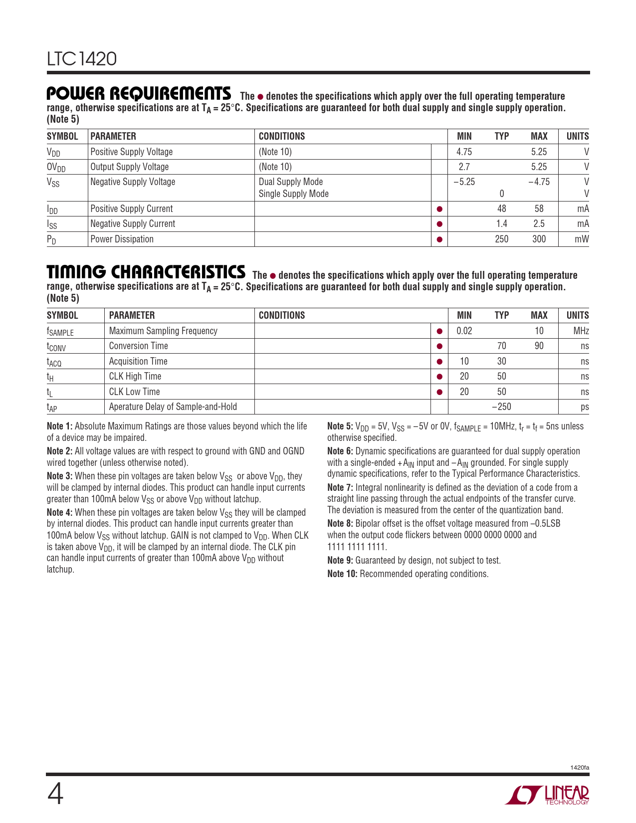 LTC1420 WUPOWER REQUIRE E TS The ● denotes the specifications which apply over the full operating temperaturerange, otherwise specifications are at TA = 25 ° C. Specifications are guaranteed for both dual supply and single supply operation.(Note 5)SYMBOLPARAMETERCONDITIONSMINTYPMAXUNITS VDD Positive Supply Voltage (Note 10) 4.75 5.25 V OVDD Output Supply Voltage (Note 10) 2.7 5.25 V VSS Negative Supply Voltage Dual Supply Mode – 5.25 – 4.75 V Single Supply Mode 0 V IDD Positive Supply Current ● 48 58 mA ISS Negative Supply Current ● 1.4 2.5 mA PD Power Dissipation ● 250 300 mW W UTI I G CHARACTERISTICS The ● denotes the specifications which apply over the full operating temperature range, otherwise specifications are at TA = 25 ° C. Specifications are guaranteed for both dual supply and single supply operation.(Note 5)SYMBOLPARAMETERCONDITIONSMINTYPMAXUNITS fSAMPLE Maximum Sampling Frequency ● 0.02 10 MHz tCONV Conversion Time ● 70 90 ns tACQ Acquisition Time ● 10 30 ns tH CLK High Time ● 20 50 ns tL CLK Low Time ● 20 50 ns tAP Aperature Delay of Sample-and-Hold – 250 ps Note 1: Absolute Maximum Ratings are those values beyond which the life Note 5: VDD = 5V, VSS = – 5V or 0V, fSAMPLE = 10MHz, tr = tf = 5ns unless of a device may be impaired. otherwise specified. Note 2: All voltage values are with respect to ground with GND and OGND Note 6: Dynamic specifications are guaranteed for dual supply operation wired together (unless otherwise noted). with a single-ended + AIN input and – AIN grounded. For single supply Note 3: When these pin voltages are taken below V dynamic specifications, refer to the Typical Performance Characteristics. SS or above VDD, they will be clamped by internal diodes. This product can handle input currents Note 7: Integral nonlinearity is defined as the deviation of a code from a greater than 100mA below VSS or above VDD without latchup. straight line passing through the actual endpoints of the transfer curve. Note 4: When these pin voltages are taken below V The deviation is measured from the center of the quantization band. SS they will be clamped by internal diodes. This product can handle input currents greater than Note 8: Bipolar offset is the offset voltage measured from –0.5LSB 100mA below VSS without latchup. GAIN is not clamped to VDD. When CLK when the output code flickers between 0000 0000 0000 and is taken above VDD, it will be clamped by an internal diode. The CLK pin 1111 1111 1111. can handle input currents of greater than 100mA above VDD without Note 9: Guaranteed by design, not subject to test. latchup. Note 10: Recommended operating conditions. 1420fa 4