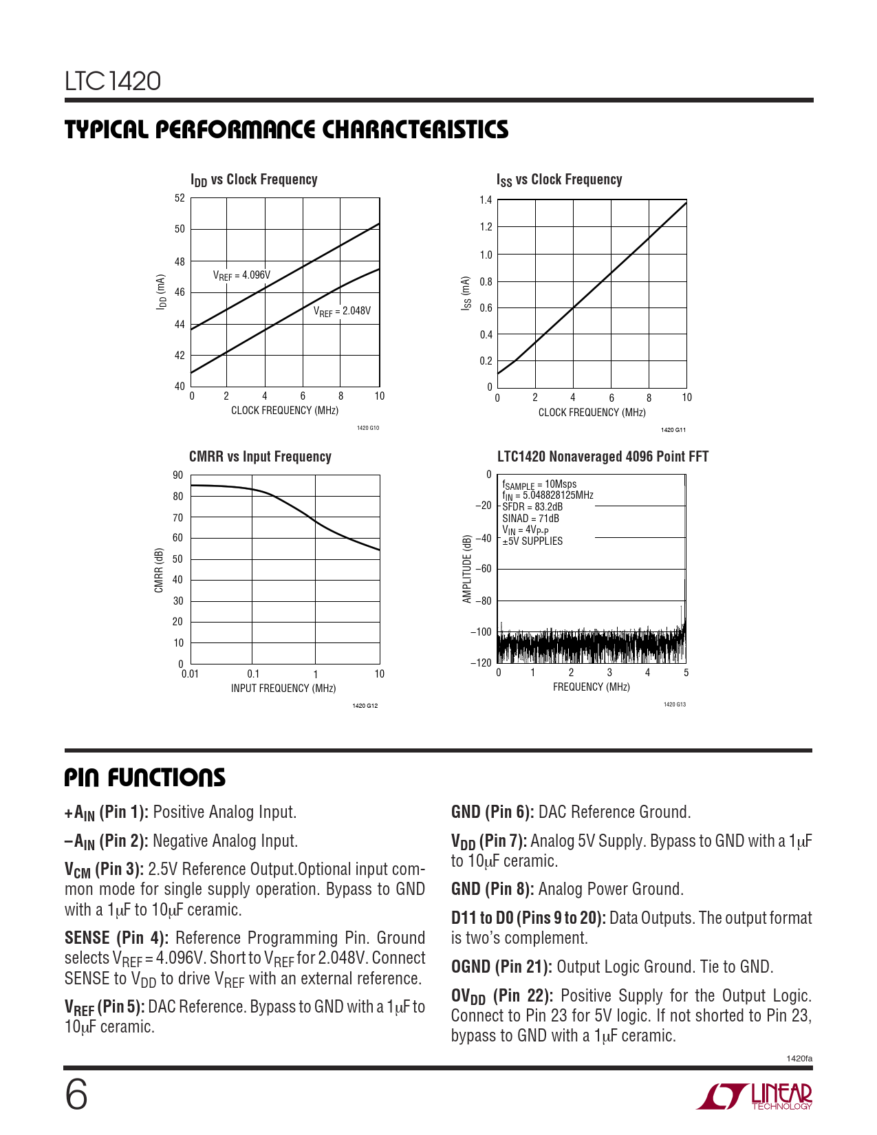 52 1.4 50 1.2 1.0 48 VREF = 4.096V 0.8 (mA) 46 (mA) I DD V I SS 0.6 REF = 2.048V 44 0.4 42 0.2 40 0 0 2 4 6 8 10 0 2 4 6 8 10 CLOCK FREQUENCY (MHz) CLOCK FREQUENCY (MHz) 1420 G10 1420 G11