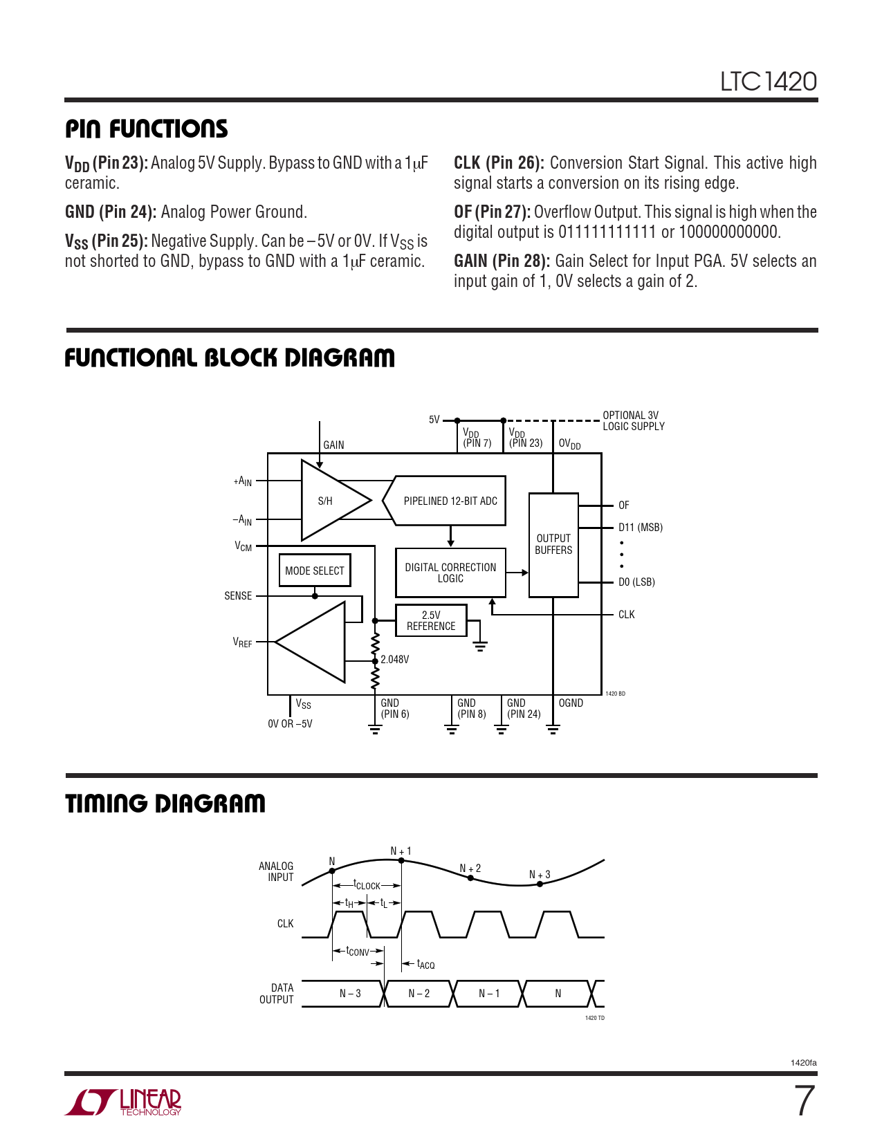 5V OPTIONAL 3V LOGIC SUPPLY VDD VDD GAIN (PIN 7) (PIN 23) OVDD +AIN S/H PIPELINED 12-BIT ADC OF –AIN D11 (MSB) OUTPUT VCM BUFFERS DIGITAL CORRECTION MODE SELECT LOGIC D0 (LSB) SENSE 2.5V CLK REFERENCE VREF 2.048V 1420 BD V GND GND OGND SS GND (PIN 6) (PIN 8) (PIN 24) 0V OR –5V