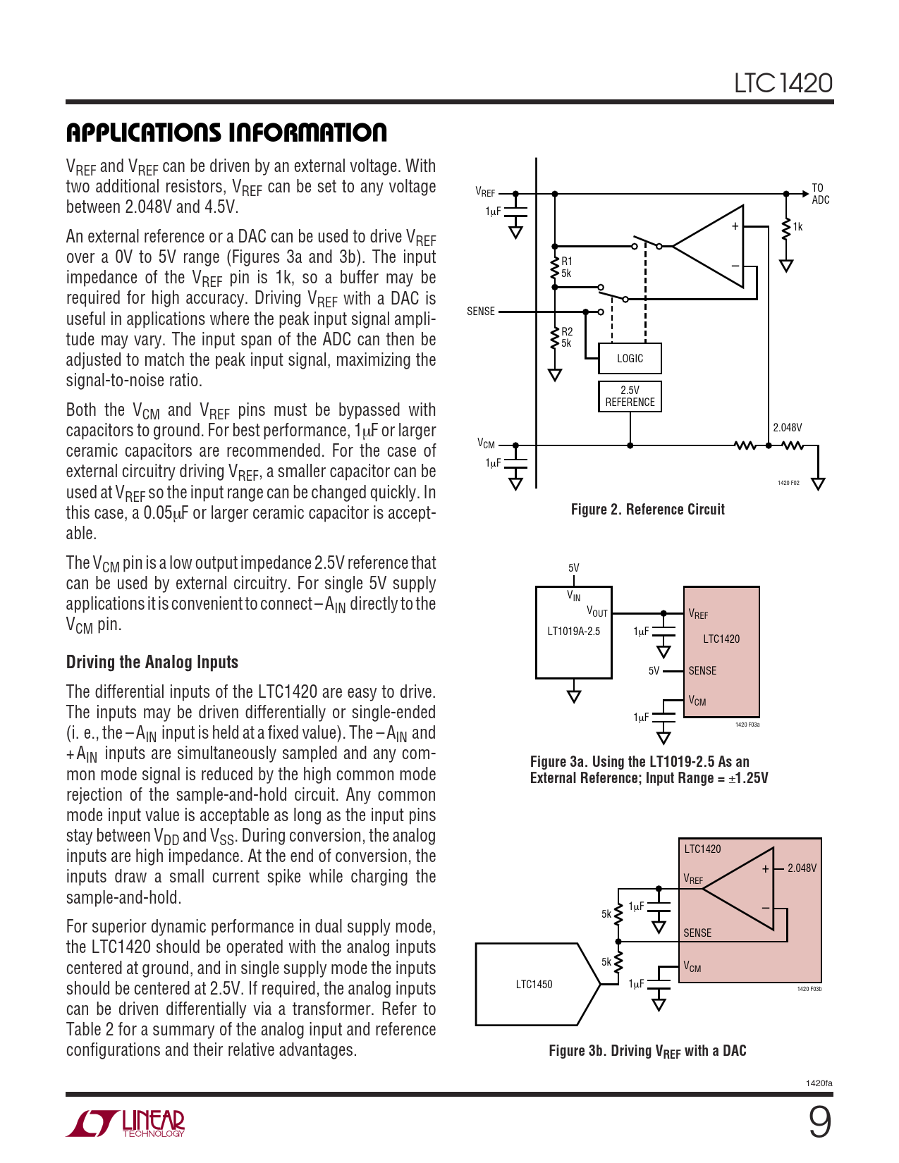 LTC1420 UUWUAPPLICATIONS INFORMATION VREF and VREF can be driven by an external voltage. With two additional resistors, VREF can be set to any voltage V TO REF ADC between 2.048V and 4.5V. 1µF + 1k An external reference or a DAC can be used to drive VREF over a 0V to 5V range (Figures 3a and 3b). The input R1 – 5k impedance of the VREF pin is 1k, so a buffer may be required for high accuracy. Driving VREF with a DAC is SENSE useful in applications where the peak input signal ampli- R2 tude may vary. The input span of the ADC can then be 5k LOGIC adjusted to match the peak input signal, maximizing the signal-to-noise ratio. 2.5V REFERENCE Both the VCM and VREF pins must be bypassed with 2.048V capacitors to ground. For best performance, 1µF or larger VCM ceramic capacitors are recommended. For the case of 1µF external circuitry driving VREF, a smaller capacitor can be 1420 F02 used at VREF so the input range can be changed quickly. In Figure 2. Reference Circuit this case, a 0.05µF or larger ceramic capacitor is accept- able. The VCM pin is a low output impedance 2.5V reference that 5V can be used by external circuitry. For single 5V supply VIN applications it is convenient to connect – AIN directly to the VOUT VREF VCM pin. LT1019A-2.5 1µF LTC1420 Driving the Analog Inputs 5V SENSE The differential inputs of the LTC1420 are easy to drive. VCM The inputs may be driven differentially or single-ended 1µF 1420 F03a (i. e., the – AIN input is held at a fixed value). The – AIN and + AIN inputs are simultaneously sampled and any com- Figure 3a. Using the LT1019-2.5 As an mon mode signal is reduced by the high common mode External Reference; Input Range = ± 1.25V rejection of the sample-and-hold circuit. Any common mode input value is acceptable as long as the input pins stay between VDD and VSS. During conversion, the analog LTC1420 inputs are high impedance. At the end of conversion, the + 2.048V inputs draw a small current spike while charging the VREF sample-and-hold. 1µF – 5k For superior dynamic performance in dual supply mode, SENSE the LTC1420 should be operated with the analog inputs 5k VCM centered at ground, and in single supply mode the inputs LTC1450 1µF 1420 F03b should be centered at 2.5V. If required, the analog inputs can be driven differentially via a transformer. Refer to Table 2 for a summary of the analog input and reference configurations and their relative advantages. Figure 3b. Driving VREF with a DAC 1420fa 9