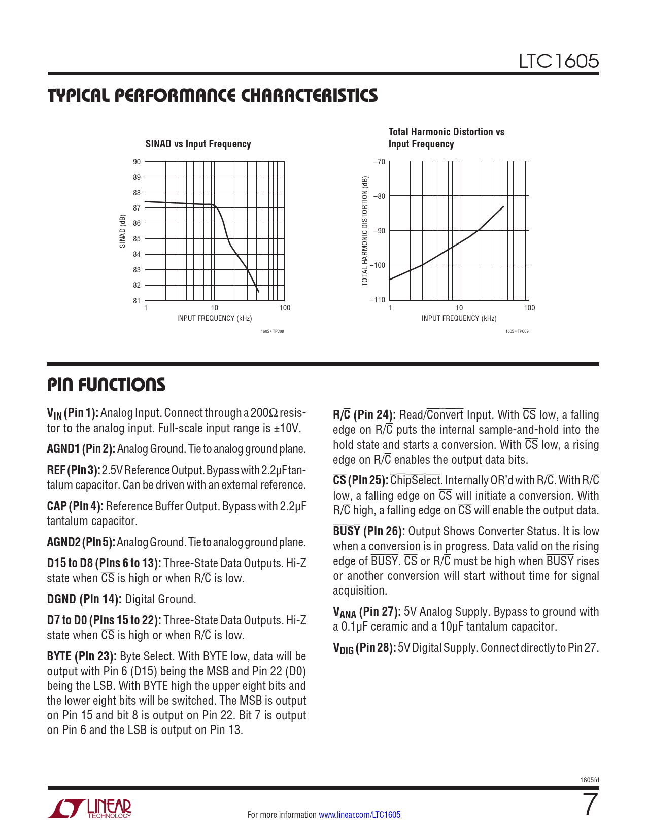 5V Digital Supply. Connect directly to Pin 27. output with Pin 6 (D15) being the MSB and Pin 22 (D0) being the LSB. With BYTE high the upper eight bits and the lower eight bits will be switched. The MSB is output on Pin 15 and bit 8 is output on Pin 22. Bit 7 is output on Pin 6 and the LSB is output on Pin 13. 1605fd For more information www.linear.com/LTC1605 7 Document Outline Features Applications Typical Application Description Absolute Maximum Ratings Order Information Pin Configuration Converter Characteristics Analog Input Dynamic Accuracy Internal Reference Characteristics Digital Inputs and Outputs Timing Characteristics Power Requirements Typical Performance Characteristics Pin Functions Test Circuit Functional Block Diagram Applications Information Package Description Revision History Package Description Related Parts