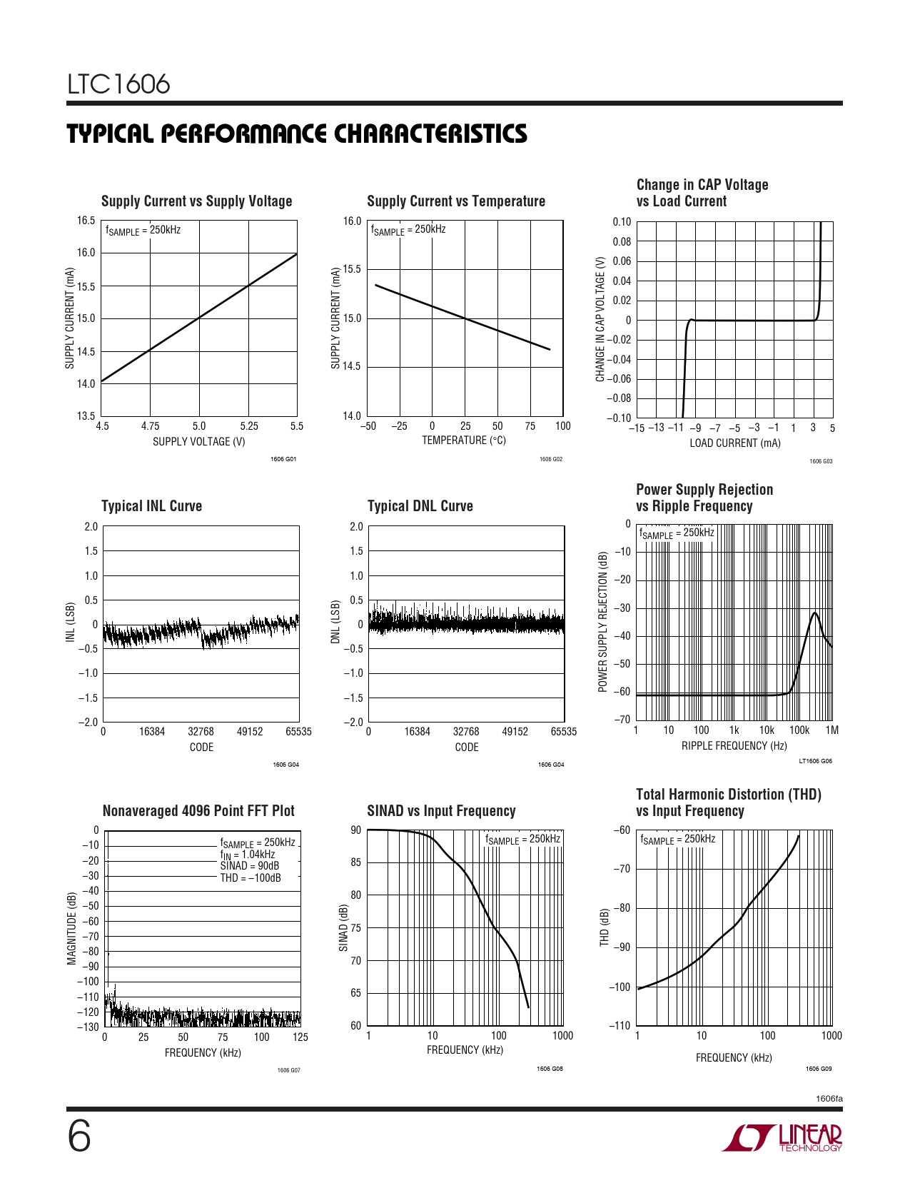16.5 16.0 0.10 fSAMPLE = 250kHz fSAMPLE = 250kHz 0.08 16.0 0.06 15.5 0.04 15.5 0.02 15.0 15.0 0 –0.02 14.5 –0.04 SUPPLY CURRENT (mA) SUPPLY CURRENT (mA) 14.5 CHANGE IN CAP VOLTAGE (V) –0.06 14.0 –0.08 13.5 14.0 –0.10 4.5 4.75 5.0 5.25 5.5 –50 –25 0 25 50 75 100 –15 –13 –11 –9 –7 –5 –3 –1 1 3 5 SUPPLY VOLTAGE (V) TEMPERATURE (°C) LOAD CURRENT (mA) 1606 G01 1606 G02 1606 G03