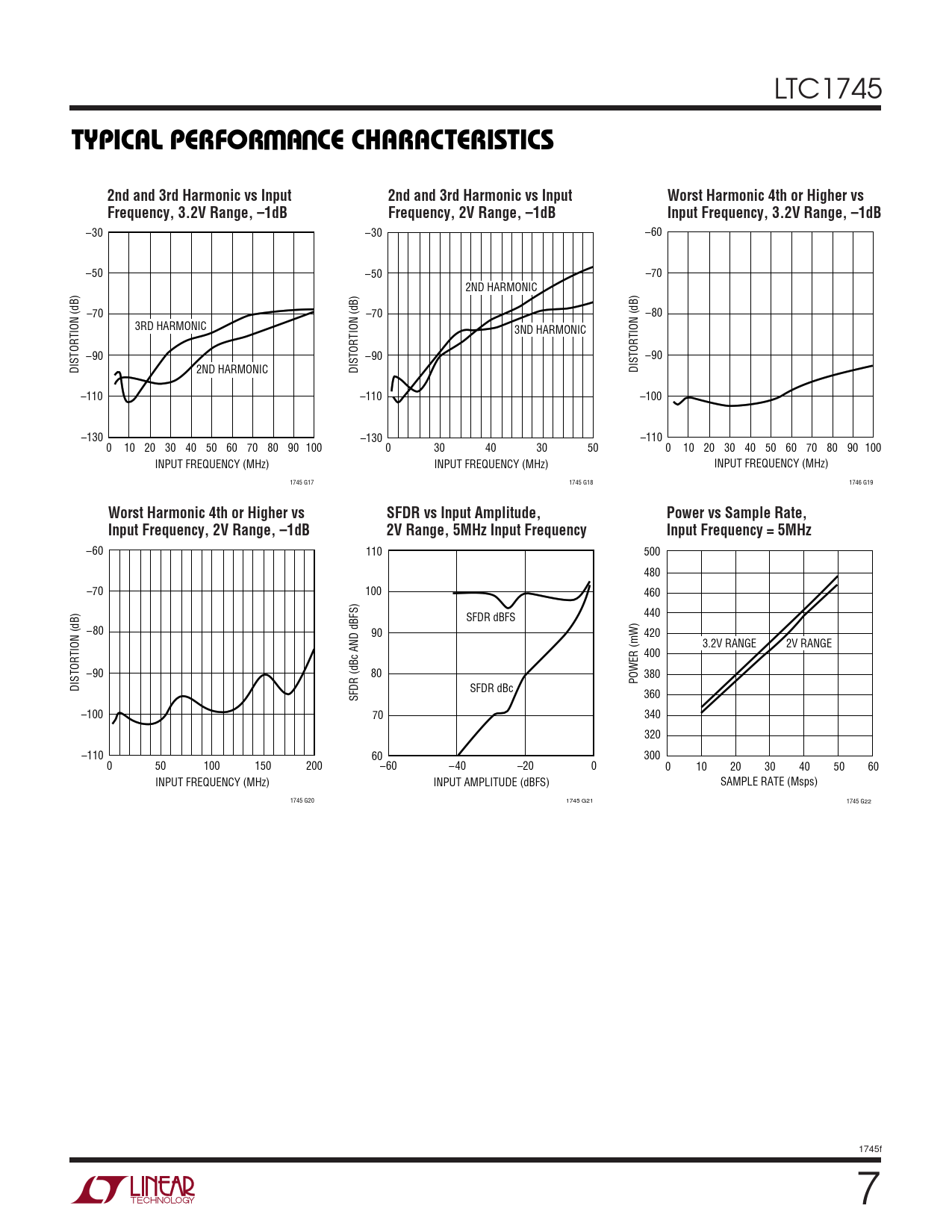–60 110 500 480 –70 100 460 SFDR dBFS 440 –80 90 420 3.2V RANGE 2V RANGE 400 –90 80 380 POWER (mW) DISTORTION (dB) SFDR dBc SFDR (dBc AND dBFS) 360 –100 70 340 320 –110 60 300 0 50 100 150 200 –60 –40 –20 0 0 10 20 30 40 50 60 INPUT FREQUENCY (MHz) INPUT AMPLITUDE (dBFS) SAMPLE RATE (Msps) 1745 G20 1745 G21 1745 G22 1745f 7