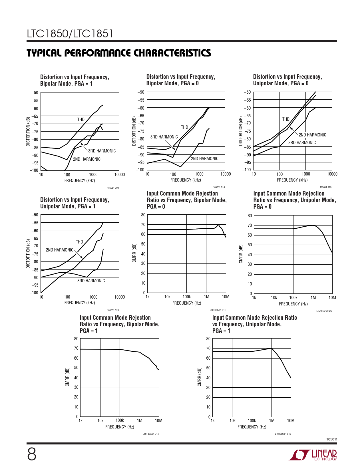 –50 80 80 –55 70 70 –60 60 60 –65 THD 50 50 –70 2ND HARMONIC –75 40 40 CMRR (dB) –80 30 CMRR (dB) 30 DISTORTION (dB) –85 20 20 –90 3RD HARMONIC 10 10 –95 –100 0 0 10 100 1000 10000 1k 10k 100k 1M 10M 1k 10k 100k 1M 10M FREQUENCY (kHz) FREQUENCY (Hz) FREQUENCY (Hz) 185051 G20 LTC1850/51 G11 LTC1850/51 G13