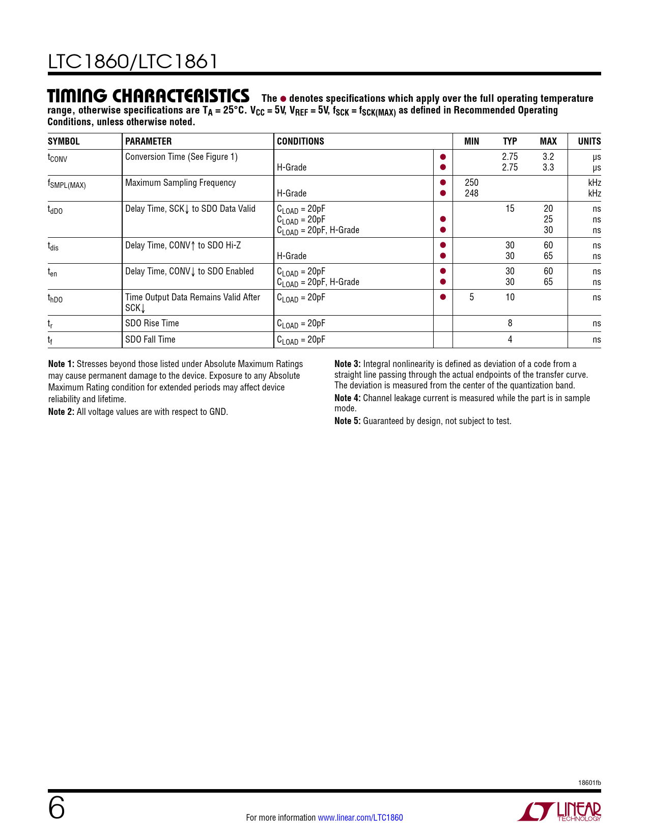 tCONV Conversion Time (See Figure 1) l 2.75 3.2 µs H-Grade l 2.75 3.3 µs fSMPL(MAX) Maximum Sampling Frequency l 250 kHz H-Grade l 248 kHz tdDO Delay Time, SCK↓ to SDO Data Valid CLOAD = 20pF 15 20 ns CLOAD = 20pF l 25 ns CLOAD = 20pF, H-Grade l 30 ns tdis Delay Time, CONV↑ to SDO Hi-Z l 30 60 ns H-Grade l 30 65 ns ten Delay Time, CONV↓ to SDO Enabled CLOAD = 20pF l 30 60 ns CLOAD = 20pF, H-Grade l 30 65 ns thDO Time Output Data Remains Valid After CLOAD = 20pF l 5 10 ns SCK↓ tr SDO Rise Time CLOAD = 20pF 8 ns tf SDO Fall Time CLOAD = 20pF 4 ns