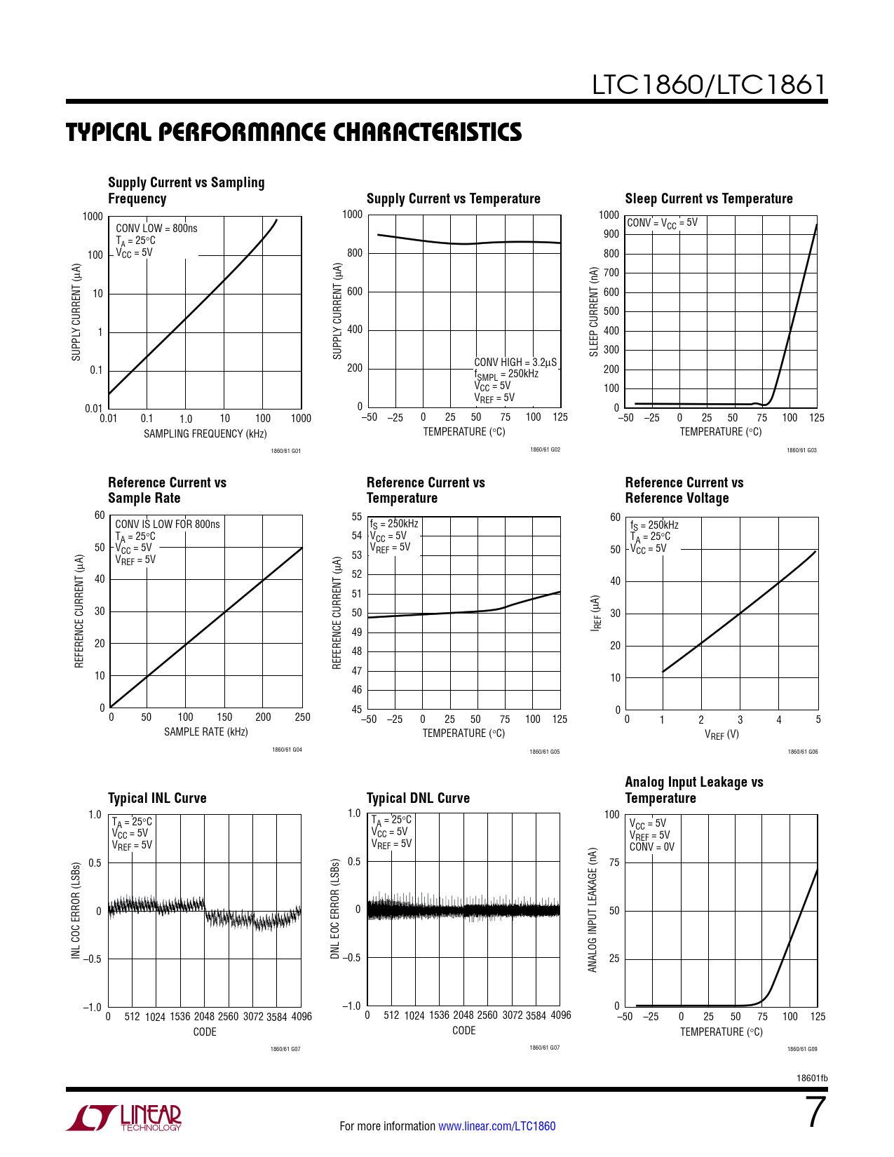 1000 1000 1000 CONV LOW = 800ns CONV = VCC = 5V T 900 A = 25°C 100 VCC = 5V 800 800 µA) µA) 700 10 600 600 500 Y CURRENT ( 1 Y CURRENT ( 400 400 300 SUPPL SUPPL SLEEP CURRENT (nA) CONV HIGH = 3.2µS 0.1 200 f 200 SMPL = 250kHz VCC = 5V 100 VREF = 5V 0.01 0 0 0.01 0.1 1.0 10 100 1000 –50 –25 0 25 50 75 100 125 –50 –25 0 25 50 75 100 125 SAMPLING FREQUENCY (kHz) TEMPERATURE (°C) TEMPERATURE (°C) 1860/61 G01 1860/61 G02 1860/61 G03