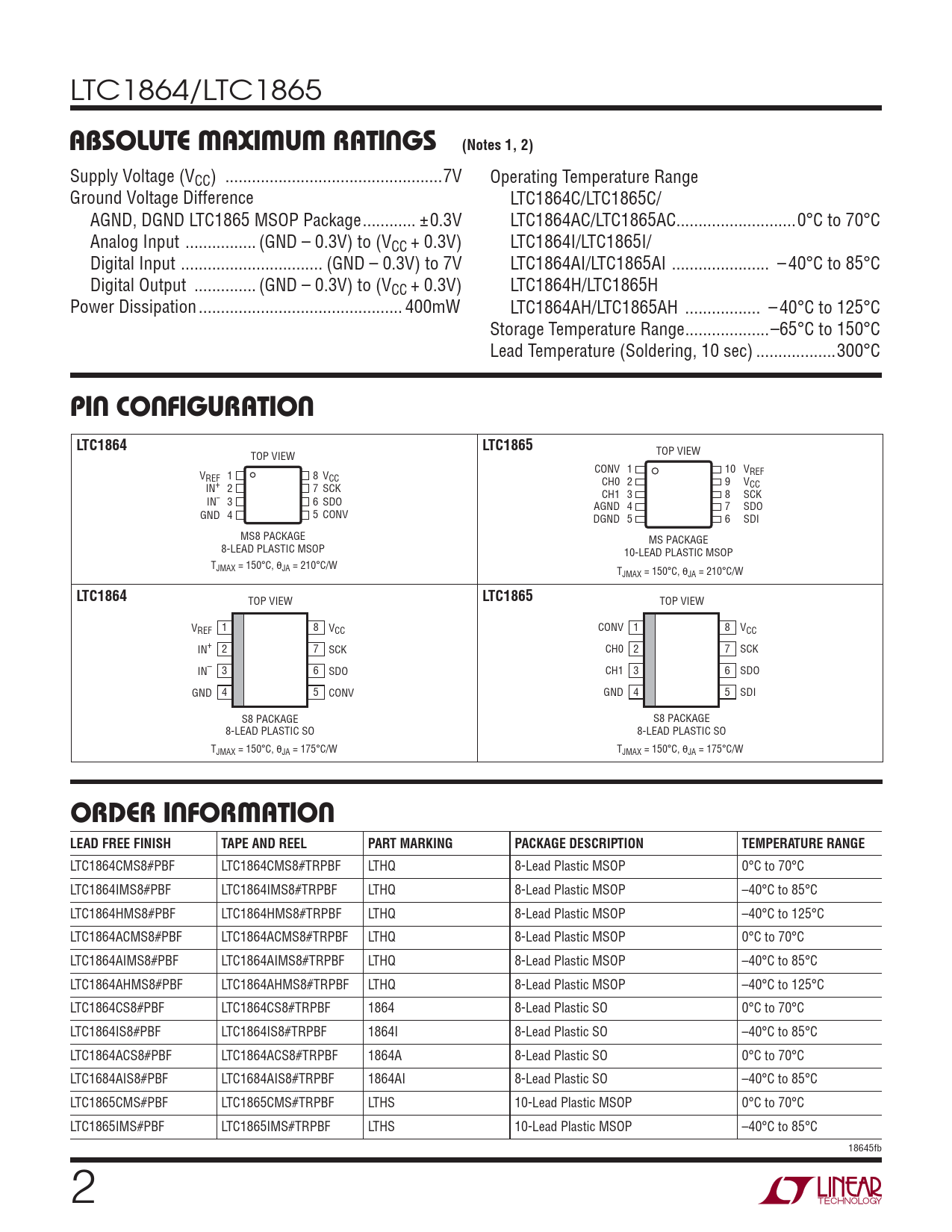 ABSOLUTE MAXIMUM RATINGS (Notes 1, 2). PIN CONFIGURATION. LTC1864. LTC1865. ORDER INFORMATION LEAD FREE FINISH. TAPE AND REEL