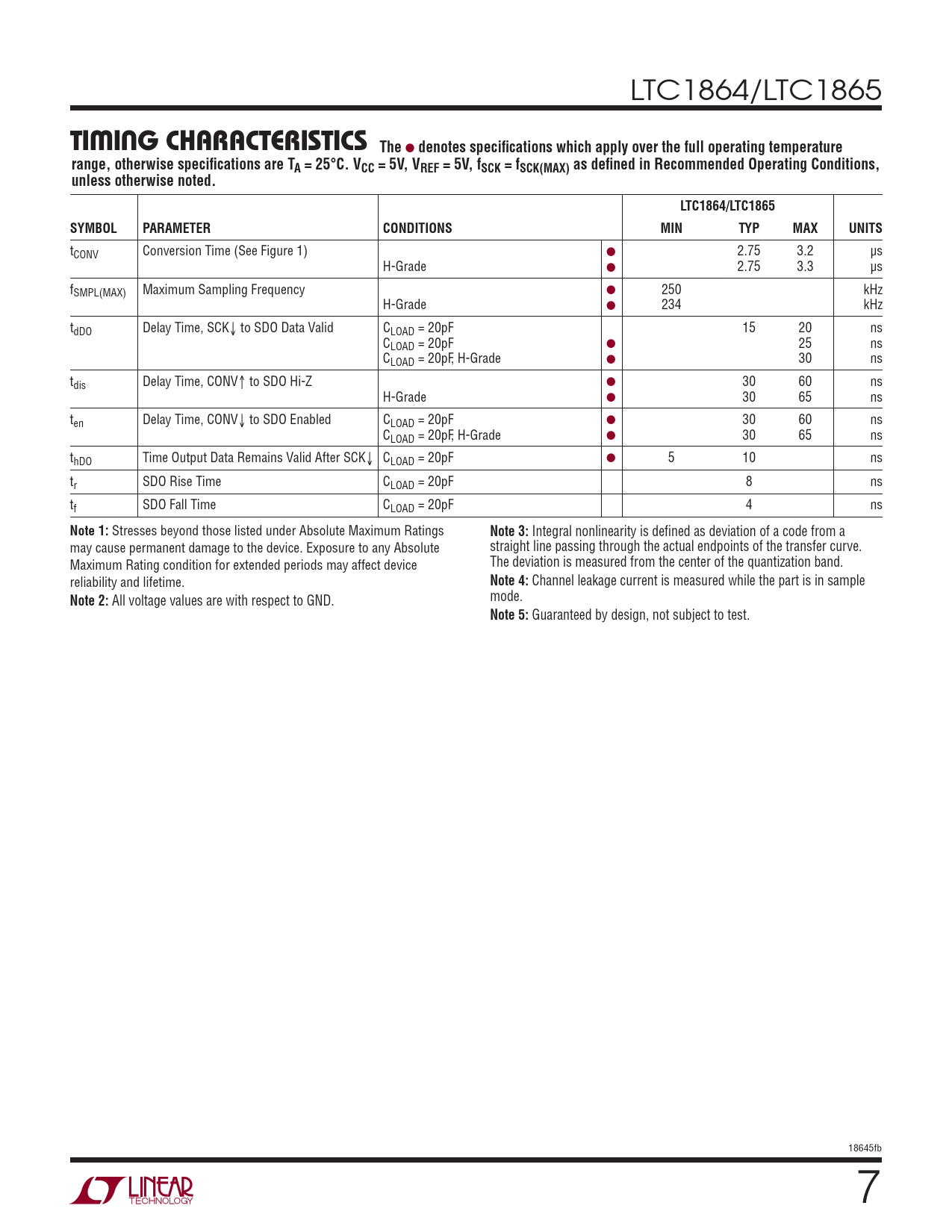 LTC1864/LTC1865 TIMING CHARACTERISTICSThe ● denotes specifi cations which apply over the full operating temperaturerange, otherwise specifi cations are TA = 25°C. VCC = 5V, VREF = 5V, fSCK = fSCK(MAX) as defi ned in Recommended Operating Conditions,unless otherwise noted.LTC1864/LTC1865SYMBOLPARAMETERCONDITIONSMINTYPMAXUNITS tCONV Conversion Time (See Figure 1) ● 2.75 3.2 μs H-Grade ● 2.75 3.3 μs fSMPL(MAX) Maximum Sampling Frequency ● 250 kHz H-Grade ● 234 kHz tdDO Delay Time, SCK↓ to SDO Data Valid CLOAD = 20pF 15 20 ns CLOAD = 20pF ● 25 ns CLOAD = 20pF, H-Grade ● 30 ns tdis Delay Time, CONV↑ to SDO Hi-Z ● 30 60 ns H-Grade ● 30 65 ns ten Delay Time, CONV↓ to SDO Enabled CLOAD = 20pF ● 30 60 ns CLOAD = 20pF, H-Grade ● 30 65 ns thDO Time Output Data Remains Valid After SCK↓ CLOAD = 20pF ● 5 10 ns tr SDO Rise Time CLOAD = 20pF 8 ns tf SDO Fall Time CLOAD = 20pF 4 ns Note 1: Stresses beyond those listed under Absolute Maximum Ratings Note 3: Integral nonlinearity is defi ned as deviation of a code from a may cause permanent damage to the device. Exposure to any Absolute straight line passing through the actual endpoints of the transfer curve. Maximum Rating condition for extended periods may affect device The deviation is measured from the center of the quantization band. reliability and lifetime. Note 4: Channel leakage current is measured while the part is in sample Note 2: All voltage values are with respect to GND. mode. Note 5: Guaranteed by design, not subject to test. 18645fb 7