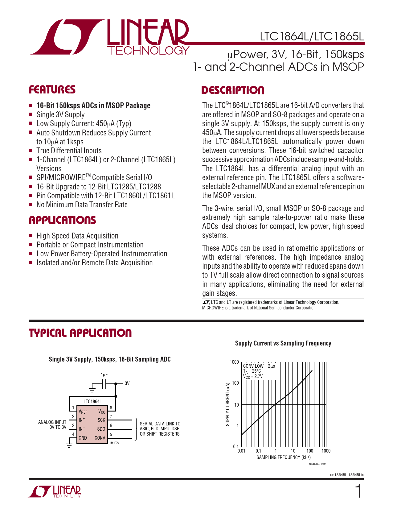 1000 CONV LOW = 2µs TA = 25°C 1µF VCC = 2.7V 3V A) 100 µ LTC1864L 10 1 8 VREF VCC 2 7 IN+ SCK ANALOG INPUT 3 6 SERIAL DATA LINK TO SUPPLY CURRENT ( 0V TO 3V 1 IN– SDO ASIC, PLD, MPU, DSP 4 5 OR SHIFT REGISTERS GND CONV 1864 TA01 0.1 0.01 0.1 1 10 100 1000 SAMPLING FREQUENCY (kHz) 1864L/65L TA02 sn18645L 18645Lfs 1