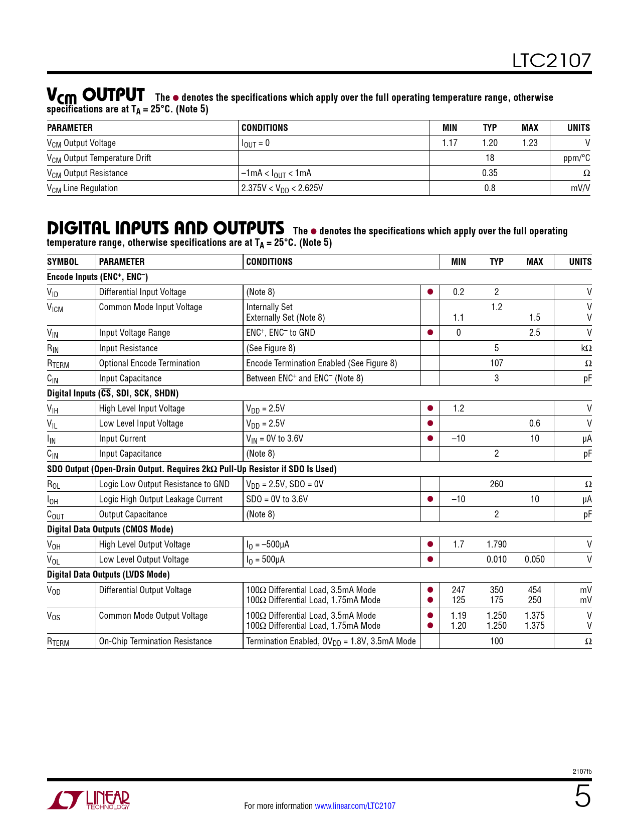 VOD Differential Output Voltage 100Ω Differential Load, 3.5mA Mode l 247 350 454 mV 100Ω Differential Load, 1.75mA Mode l 125 175 250 mV VOS Common Mode Output Voltage 100Ω Differential Load, 3.5mA Mode l 1.19 1.250 1.375 V 100Ω Differential Load, 1.75mA Mode l 1.20 1.250 1.375 V RTERM On-Chip Termination Resistance Termination Enabled, OVDD = 1.8V, 3.5mA Mode 100 Ω 2107fb For more information www.linear.com/LTC2107 5 Document Outline Features Applications Description Block Diagram Absolute Maximum Ratings Pin Configuration Order Information Converter Characteristics Analog Input Dynamic Accuracy VCM Output Digital Inputs and OUtputs Power Requirements Timing Characteristics Timing Diagrams Typical Performance Characteristics Pin Functions Block Diagram Applications Information Package Description Typical Application Related Parts