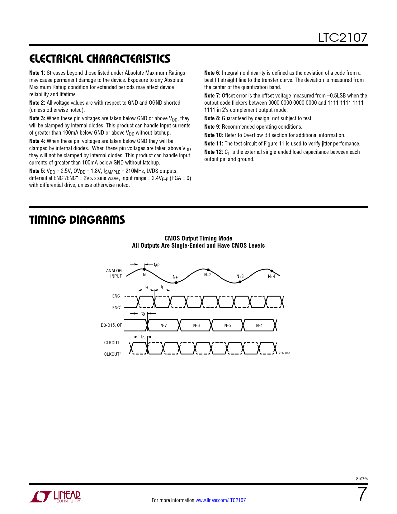 tAP ANALOG INPUT N N+1 N+2 N+3 N+4 tH tL ENC– ENC+ tD D0-D15, OF N-7 N-6 N-5 N-4 tC CLKOUT– 2107 TD01 CLKOUT+ 2107fb For more information www.linear.com/LTC2107 7 Document Outline Features Applications Description Block Diagram Absolute Maximum Ratings Pin Configuration Order Information Converter Characteristics Analog Input Dynamic Accuracy VCM Output Digital Inputs and OUtputs Power Requirements Timing Characteristics Timing Diagrams Typical Performance Characteristics Pin Functions Block Diagram Applications Information Package Description Typical Application Related Parts