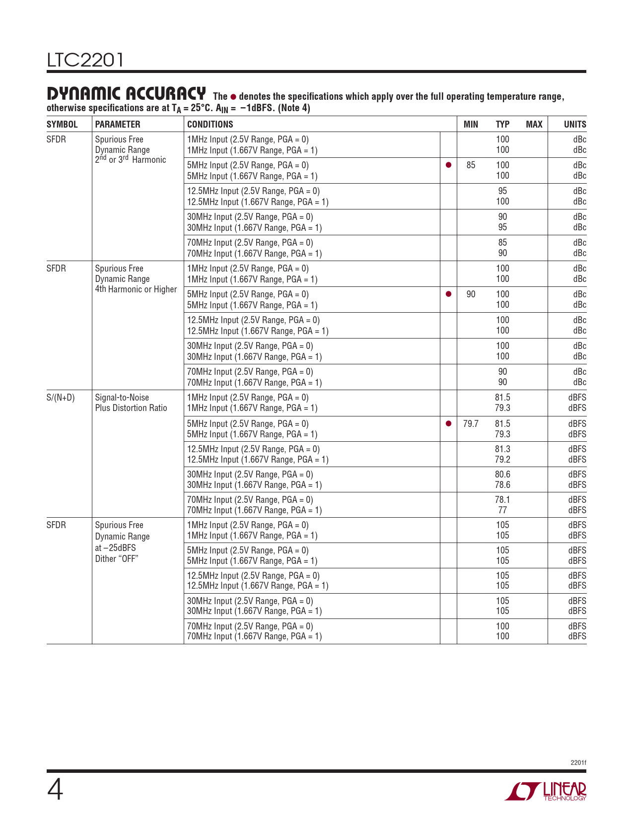 SFDR Spurious Free 1MHz Input (2.5V Range, PGA = 0) 100 dBc Dynamic Range 1MHz Input (1.667V Range, PGA = 1) 100 dBc 2nd or 3rd Harmonic 5MHz Input (2.5V Range, PGA = 0) l 85 100 dBc 5MHz Input (1.667V Range, PGA = 1) 100 dBc 12.5MHz Input (2.5V Range, PGA = 0) 95 dBc 12.5MHz Input (1.667V Range, PGA = 1) 100 dBc 30MHz Input (2.5V Range, PGA = 0) 90 dBc 30MHz Input (1.667V Range, PGA = 1) 95 dBc 70MHz Input (2.5V Range, PGA = 0) 85 dBc 70MHz Input (1.667V Range, PGA = 1) 90 dBc SFDR Spurious Free 1MHz Input (2.5V Range, PGA = 0) 100 dBc Dynamic Range 1MHz Input (1.667V Range, PGA = 1) 100 dBc 4th Harmonic or Higher 5MHz Input (2.5V Range, PGA = 0) l 90 100 dBc 5MHz Input (1.667V Range, PGA = 1) 100 dBc 12.5MHz Input (2.5V Range, PGA = 0) 100 dBc 12.5MHz Input (1.667V Range, PGA = 1) 100 dBc 30MHz Input (2.5V Range, PGA = 0) 100 dBc 30MHz Input (1.667V Range, PGA = 1) 100 dBc 70MHz Input (2.5V Range, PGA = 0) 90 dBc 70MHz Input (1.667V Range, PGA = 1) 90 dBc S/(N+D) Signal-to-Noise 1MHz Input (2.5V Range, PGA = 0) 81.5 dBFS Plus Distortion Ratio 1MHz Input (1.667V Range, PGA = 1) 79.3 dBFS 5MHz Input (2.5V Range, PGA = 0) l 79.7 81.5 dBFS 5MHz Input (1.667V Range, PGA = 1) 79.3 dBFS 12.5MHz Input (2.5V Range, PGA = 0) 81.3 dBFS 12.5MHz Input (1.667V Range, PGA = 1) 79.2 dBFS 30MHz Input (2.5V Range, PGA = 0) 80.6 dBFS 30MHz Input (1.667V Range, PGA = 1) 78.6 dBFS 70MHz Input (2.5V Range, PGA = 0) 78.1 dBFS 70MHz Input (1.667V Range, PGA = 1) 77 dBFS SFDR Spurious Free 1MHz Input (2.5V Range, PGA = 0) 105 dBFS Dynamic Range 1MHz Input (1.667V Range, PGA = 1) 105 dBFS at –25dBFS 5MHz Input (2.5V Range, PGA = 0) 105 dBFS Dither “OFF” 5MHz Input (1.667V Range, PGA = 1) 105 dBFS 12.5MHz Input (2.5V Range, PGA = 0) 105 dBFS 12.5MHz Input (1.667V Range, PGA = 1) 105 dBFS 30MHz Input (2.5V Range, PGA = 0) 105 dBFS 30MHz Input (1.667V Range, PGA = 1) 105 dBFS 70MHz Input (2.5V Range, PGA = 0) 100 dBFS 70MHz Input (1.667V Range, PGA = 1) 100 dBFS 2201f 4