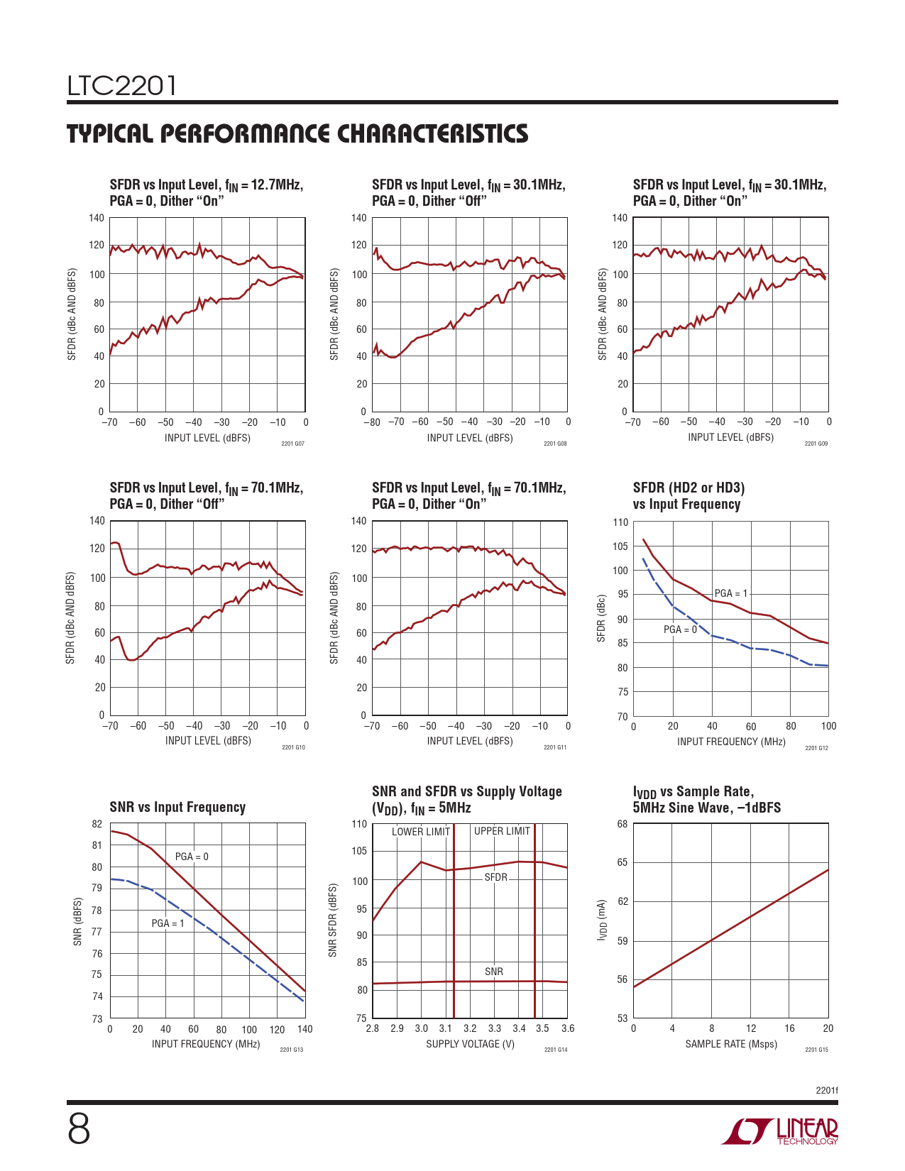 82 110 68 LOWER LIMIT UPPER LIMIT 81 105 PGA = 0 80 65 100 SFDR 79 62 78 95 PGA = 1 (mA) 77 90 SNR (dBFS) I VDD 59 76 SNR SFDR (dBFS) 85 75 SNR 56 80 74 73 75 53 0 20 40 60 80 100 120 140 2.8 2.9 3.0 3.1 3.2 3.3 3.4 3.5 3.6 0 4 8 12 16 20 INPUT FREQUENCY (MHz) SUPPLY VOLTAGE (V) SAMPLE RATE (Msps) 2201 G13 2201 G14 2201 G15 2201f 8
