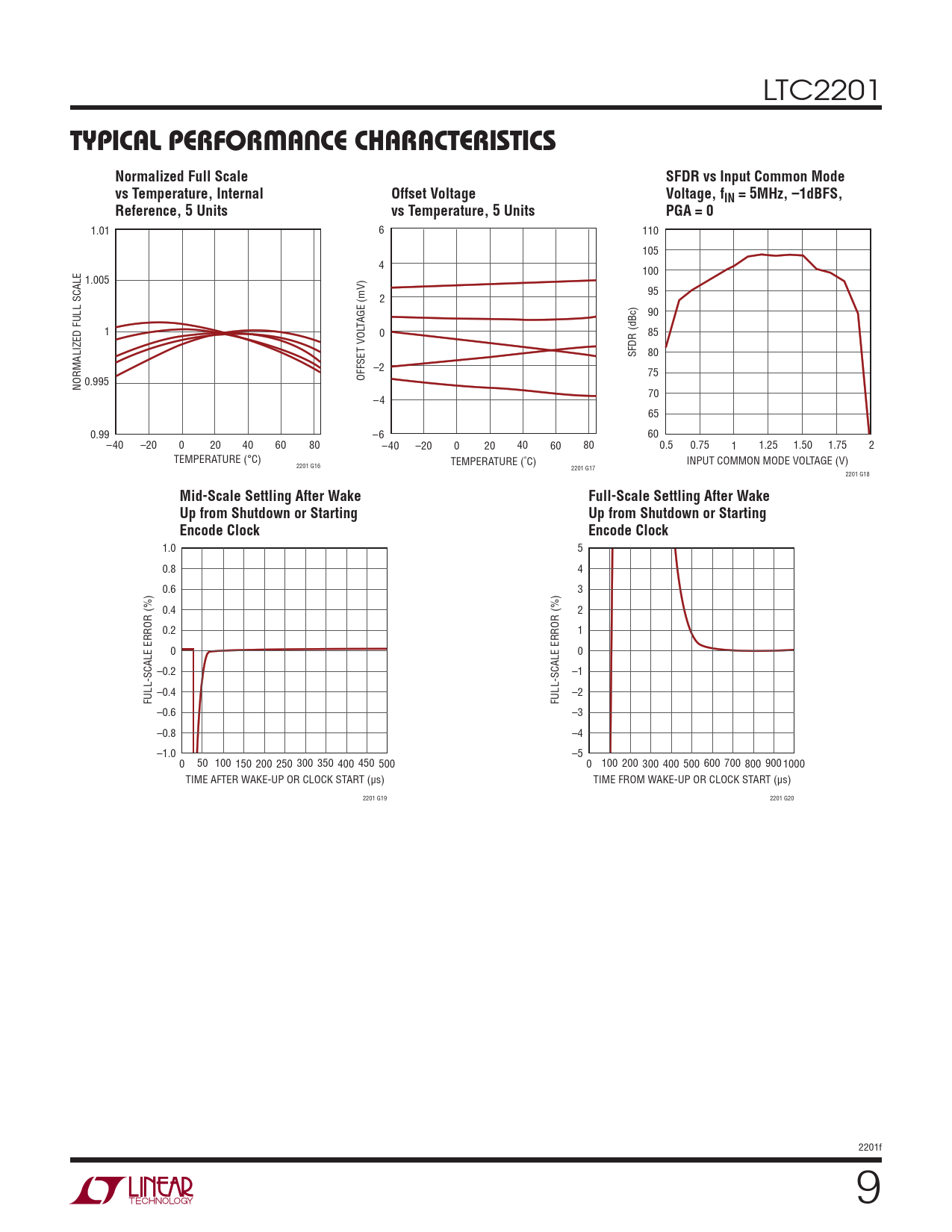 1.01 6 110 105 4 100 1.005 95 2 90 TAGE (mV) 1 0 85 SFDR (dBc) 80 –2 75 OFFSET VOL NORMALIZED FULL SCALE 0.995 70 –4 65 0.99 –6 60 –40 –20 0 20 40 60 80 –40 –20 0 20 40 60 80 0.5 0.75 1 1.25 1.50 1.75 2 TEMPERATURE (°C) TEMPERATURE (˚C) INPUT COMMON MODE VOLTAGE (V) 2201 G16 2201 G17 2201 G18