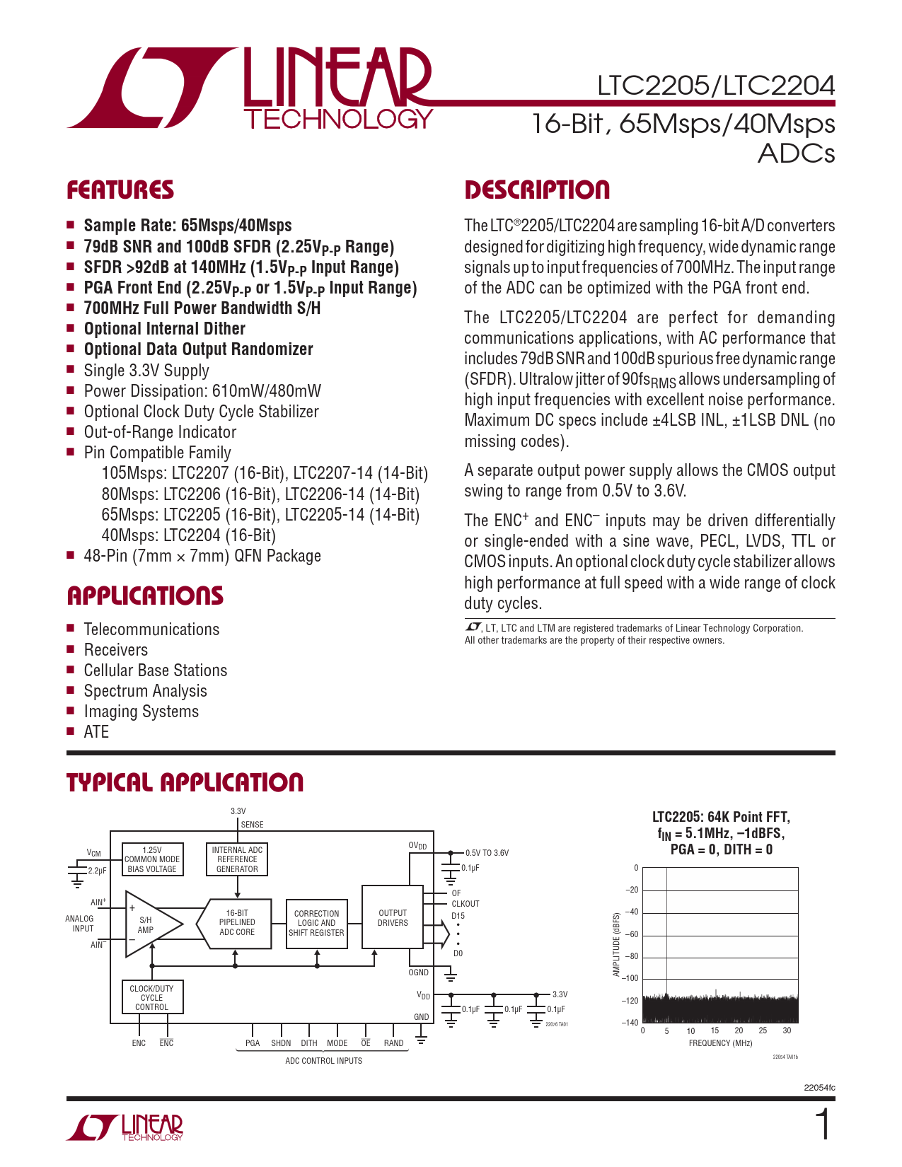 LTC2205/LTC2204 16-Bit, 65Msps/40Msps ADCs FEATURESDESCRIPTION n Sample Rate: 65Msps/40Msps The LTC®2205/LTC2204 are sampling 16-bit A/D converters n 79dB SNR and 100dB SFDR (2.25VP-P Range) designed for digitizing high frequency, wide dynamic range n SFDR >92dB at 140MHz (1.5VP-P Input Range) signals up to input frequencies of 700MHz. The input range n PGA Front End (2.25VP-P or 1.5VP-P Input Range) of the ADC can be optimized with the PGA front end. n 700MHz Full Power Bandwidth S/H The LTC2205/LTC2204 are perfect for demanding n Optional Internal Dither communications applications, with AC performance that n Optional Data Output Randomizer includes 79dB SNR and 100dB spurious free dynamic range n Single 3.3V Supply (SFDR). Ultralow jitter of 90fsRMS allows undersampling of n Power Dissipation: 610mW/480mW high input frequencies with excellent noise performance. n Optional Clock Duty Cycle Stabilizer Maximum DC specs include ±4LSB INL, ±1LSB DNL (no n Out-of-Range Indicator missing codes). n Pin Compatible Family 105Msps: LTC2207 (16-Bit), LTC2207-14 (14-Bit) A separate output power supply allows the CMOS output 80Msps: LTC2206 (16-Bit), LTC2206-14 (14-Bit) swing to range from 0.5V to 3.6V. 65Msps: LTC2205 (16-Bit), LTC2205-14 (14-Bit) The ENC+ and ENC– inputs may be driven differentially 40Msps: LTC2204 (16-Bit) or single-ended with a sine wave, PECL, LVDS, TTL or n 48-Pin (7mm × 7mm) QFN Package CMOS inputs. An optional clock duty cycle stabilizer allows high performance at full speed with a wide range of clock APPLICATIONS duty cycles. n Telecommunications , LT, LTC and LTM are registered trademarks of Linear Technology Corporation. All other trademarks are the property of their respective owners. n Receivers n Cellular Base Stations n Spectrum Analysis n Imaging Systems n ATE TYPICAL APPLICATION 3.3V LTC2205: 64K Point FFT, SENSE fIN = 5.1MHz, –1dBFS, OV 1.25V INTERNAL ADC DD V PGA = 0, DITH = 0 CM 0.5V TO 3.6V COMMON MODE REFERENCE 2.2μF BIAS VOLTAGE GENERATOR 0.1μF 0 OF –20 AIN+ + CLKOUT 16-BIT CORRECTION OUTPUT D15 –40 ANALOG S/H PIPELINED LOGIC AND DRIVERS • INPUT AMP ADC CORE SHIFT REGISTER –60 – • AIN– • D0 –80 OGND AMPLITUDE (dBFS) –100 CLOCK/DUTY CYCLE V 3.3V DD –120 CONTROL 0.1μF 0.1μF 0.1μF GND 22076 TA01 –140 0 5 10 15 20 25 30 ENC ENC PGA SHDN DITH MODE OE RAND FREQUENCY (MHz) 22054 TA01b ADC CONTROL INPUTS 22054fc 1
