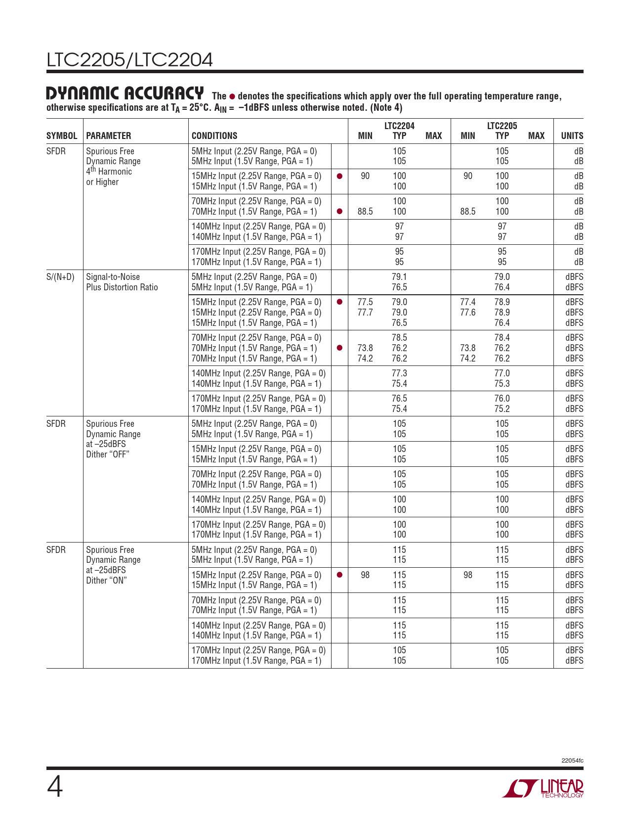 SFDR Spurious Free 5MHz Input (2.25V Range, PGA = 0) 105 105 dB Dynamic Range 5MHz Input (1.5V Range, PGA = 1) 105 105 dB 4th Harmonic 15MHz Input (2.25V Range, PGA = 0) l 90 100 90 100 dB or Higher 15MHz Input (1.5V Range, PGA = 1) 100 100 dB 70MHz Input (2.25V Range, PGA = 0) 100 100 dB 70MHz Input (1.5V Range, PGA = 1) l 88.5 100 88.5 100 dB 140MHz Input (2.25V Range, PGA = 0) 97 97 dB 140MHz Input (1.5V Range, PGA = 1) 97 97 dB 170MHz Input (2.25V Range, PGA = 0) 95 95 dB 170MHz Input (1.5V Range, PGA = 1) 95 95 dB S/(N+D) Signal-to-Noise 5MHz Input (2.25V Range, PGA = 0) 79.1 79.0 dBFS Plus Distortion Ratio 5MHz Input (1.5V Range, PGA = 1) 76.5 76.4 dBFS 15MHz Input (2.25V Range, PGA = 0) l 77.5 79.0 77.4 78.9 dBFS 15MHz Input (2.25V Range, PGA = 0) 77.7 79.0 77.6 78.9 dBFS 15MHz Input (1.5V Range, PGA = 1) 76.5 76.4 dBFS 70MHz Input (2.25V Range, PGA = 0) 78.5 78.4 dBFS 70MHz Input (1.5V Range, PGA = 1) l 73.8 76.2 73.8 76.2 dBFS 70MHz Input (1.5V Range, PGA = 1) 74.2 76.2 74.2 76.2 dBFS 140MHz Input (2.25V Range, PGA = 0) 77.3 77.0 dBFS 140MHz Input (1.5V Range, PGA = 1) 75.4 75.3 dBFS 170MHz Input (2.25V Range, PGA = 0) 76.5 76.0 dBFS 170MHz Input (1.5V Range, PGA = 1) 75.4 75.2 dBFS SFDR Spurious Free 5MHz Input (2.25V Range, PGA = 0) 105 105 dBFS Dynamic Range 5MHz Input (1.5V Range, PGA = 1) 105 105 dBFS at –25dBFS 15MHz Input (2.25V Range, PGA = 0) 105 105 dBFS Dither “OFF” 15MHz Input (1.5V Range, PGA = 1) 105 105 dBFS 70MHz Input (2.25V Range, PGA = 0) 105 105 dBFS 70MHz Input (1.5V Range, PGA = 1) 105 105 dBFS 140MHz Input (2.25V Range, PGA = 0) 100 100 dBFS 140MHz Input (1.5V Range, PGA = 1) 100 100 dBFS 170MHz Input (2.25V Range, PGA = 0) 100 100 dBFS 170MHz Input (1.5V Range, PGA = 1) 100 100 dBFS SFDR Spurious Free 5MHz Input (2.25V Range, PGA = 0) 115 115 dBFS Dynamic Range 5MHz Input (1.5V Range, PGA = 1) 115 115 dBFS at –25dBFS 15MHz Input (2.25V Range, PGA = 0) l 98 115 98 115 dBFS Dither “ON” 15MHz Input (1.5V Range, PGA = 1) 115 115 dBFS 70MHz Input (2.25V Range, PGA = 0) 115 115 dBFS 70MHz Input (1.5V Range, PGA = 1) 115 115 dBFS 140MHz Input (2.25V Range, PGA = 0) 115 115 dBFS 140MHz Input (1.5V Range, PGA = 1) 115 115 dBFS 170MHz Input (2.25V Range, PGA = 0) 105 105 dBFS 170MHz Input (1.5V Range, PGA = 1) 105 105 dBFS 22054fc 4