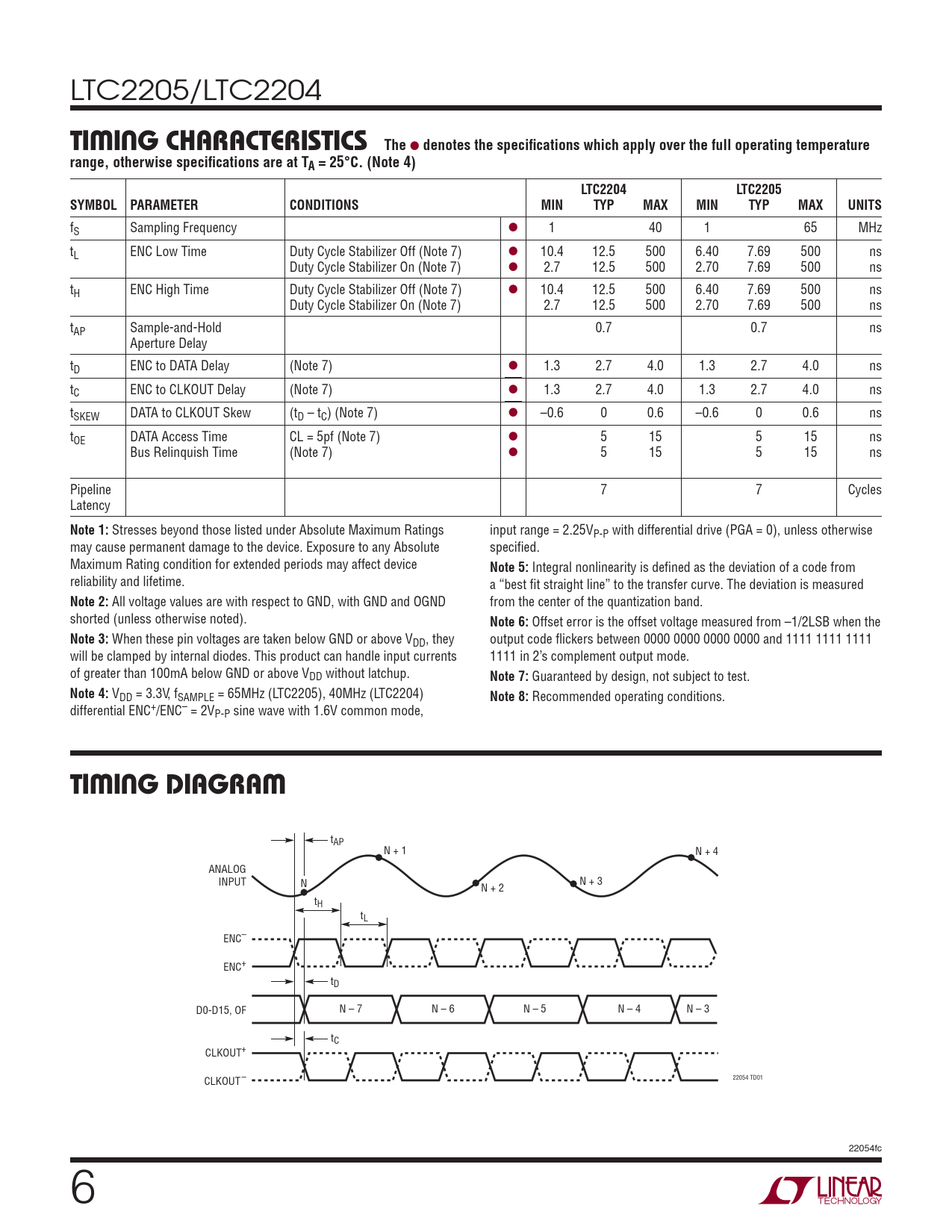 LTC2205/LTC2204 TheTIMING CHARACTERISTICS l denotes the specifi cations which apply over the full operating temperaturerange, otherwise specifi cations are at TA = 25°C. (Note 4)LTC2204LTC2205SYMBOL PARAMETERCONDITIONSMINTYPMAXMINTYPMAXUNITS fS Sampling Frequency l 1 40 1 65 MHz tL ENC Low Time Duty Cycle Stabilizer Off (Note 7) l 10.4 12.5 500 6.40 7.69 500 ns Duty Cycle Stabilizer On (Note 7) l 2.7 12.5 500 2.70 7.69 500 ns tH ENC High Time Duty Cycle Stabilizer Off (Note 7) l 10.4 12.5 500 6.40 7.69 500 ns Duty Cycle Stabilizer On (Note 7) 2.7 12.5 500 2.70 7.69 500 ns tAP Sample-and-Hold 0.7 0.7 ns Aperture Delay tD ENC to DATA Delay (Note 7) l 1.3 2.7 4.0 1.3 2.7 4.0 ns tC ENC to CLKOUT Delay (Note 7) l 1.3 2.7 4.0 1.3 2.7 4.0 ns tSKEW DATA to CLKOUT Skew (tD – tC) (Note 7) l –0.6 0 0.6 –0.6 0 0.6 ns tOE DATA Access Time CL = 5pf (Note 7) l 5 15 5 15 ns Bus Relinquish Time (Note 7) l 5 15 5 15 ns Pipeline 7 7 Cycles Latency Note 1: Stresses beyond those listed under Absolute Maximum Ratings input range = 2.25VP-P with differential drive (PGA = 0), unless otherwise may cause permanent damage to the device. Exposure to any Absolute specifi ed. Maximum Rating condition for extended periods may affect device Note 5: Integral nonlinearity is defi ned as the deviation of a code from reliability and lifetime. a “best fi t straight line” to the transfer curve. The deviation is measured Note 2: All voltage values are with respect to GND, with GND and OGND from the center of the quantization band. shorted (unless otherwise noted). Note 6: Offset error is the offset voltage measured from –1/2LSB when the Note 3: When these pin voltages are taken below GND or above VDD, they output code fl ickers between 0000 0000 0000 0000 and 1111 1111 1111 will be clamped by internal diodes. This product can handle input currents 1111 in 2’s complement output mode. of greater than 100mA below GND or above VDD without latchup. Note 7: Guaranteed by design, not subject to test. Note 4: VDD = 3.3V, fSAMPLE = 65MHz (LTC2205), 40MHz (LTC2204) Note 8: Recommended operating conditions. differential ENC+/ENC– = 2VP-P sine wave with 1.6V common mode, TIMING DIAGRAM tAP N + 1 N + 4 ANALOG INPUT N N + 3 N + 2 tH tL ENC– ENC+ tD D0-D15, OF N – 7 N – 6 N – 5 N – 4 N – 3 tC CLKOUT+ CLKOUT – 22054 TD01 22054fc 6