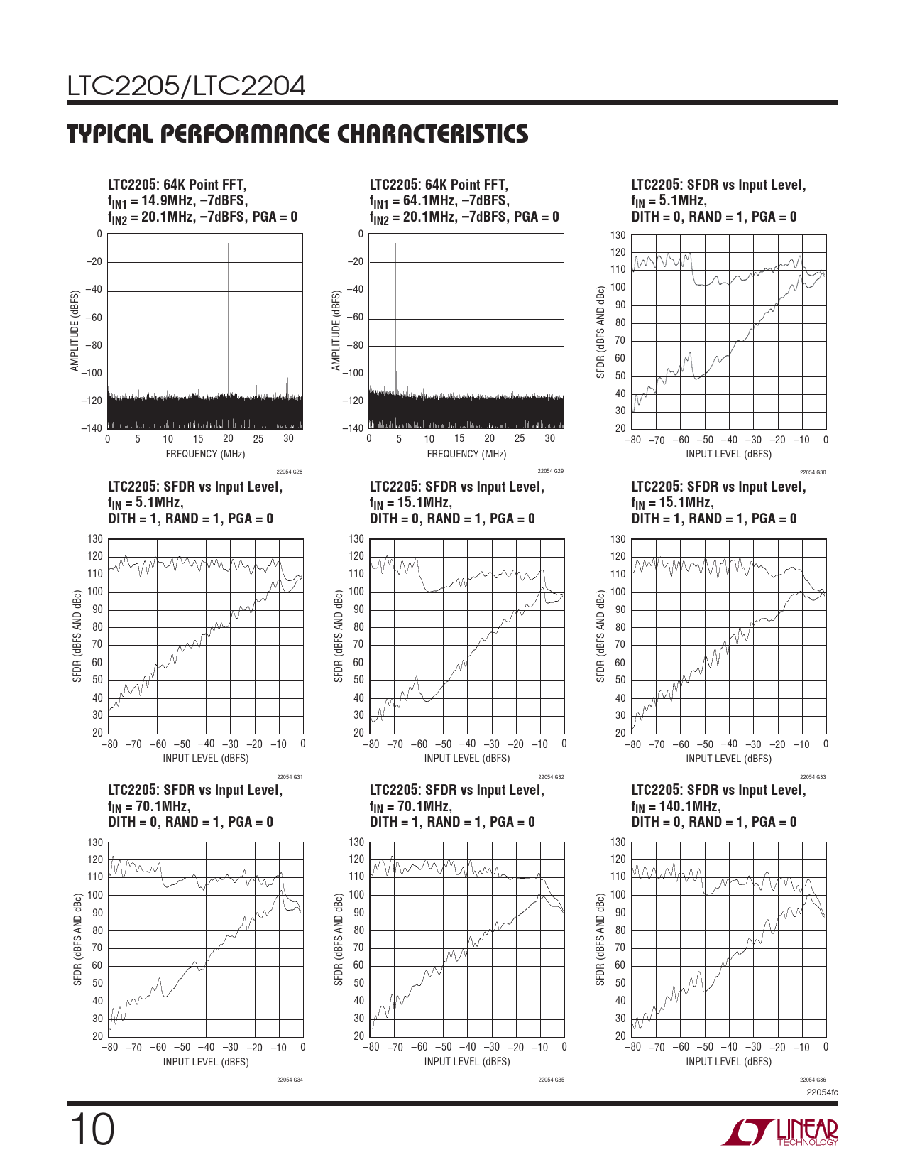 0 0 130 120 –20 –20 110 –40 –40 100 90 –60 –60 80 70 –80 –80 60 AMPLITUDE (dBFS) AMPLITUDE (dBFS) –100 –100 SFDR (dBFS AND dBc) 50 40 –120 –120 30 –140 –140 20 0 5 10 15 20 25 30 0 5 10 15 20 25 30 –80 –70 –60 –50 –40 –30 –20 –10 0 FREQUENCY (MHz) FREQUENCY (MHz) INPUT LEVEL (dBFS) 22054 G28 22054 G29 22054 G30