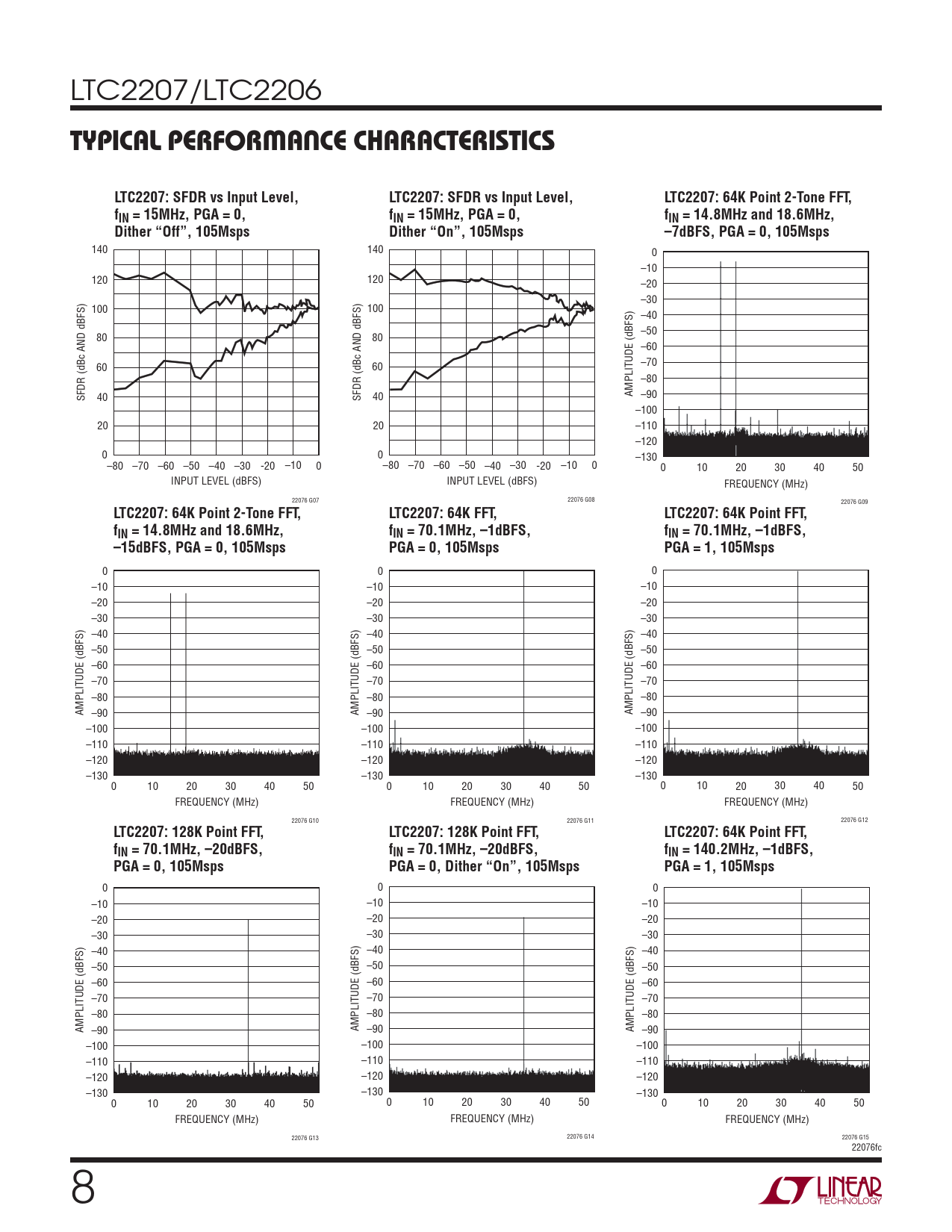 LTC2207: 128K Point FFT, LTC2207: 128K Point FFT, LTC2207: 64K Point FFT, fIN = 70.1MHz, –20dBFS, fIN = 70.1MHz, –20dBFS, fIN = 140.2MHz, –1dBFS, PGA = 0, 105Msps PGA = 0, Dither “On”, 105Msps PGA = 1, 105Msps