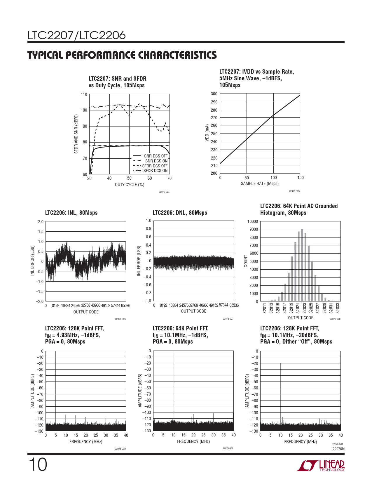 110 300 290 100 280 270 90 260 250 80 IVDD (mA) 240 230 SFDR AND SNR (dBFS) SNR DCS OFF 70 220 SNR DCS ON SFDR DCS OFF 210 SFDR DCS ON 60 200 30 40 50 60 70 0 50 100 150 DUTY CYCLE (%) SAMPLE RATE (Msps) 22076 G24 22076 G25