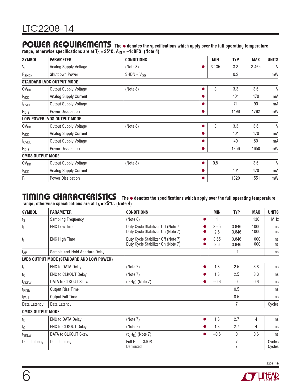 LTC2208-14 ThePOWER REQUIREMENTS l denotes the specifi cations which apply over the full operating temperaturerange, otherwise specifi cations are at TA = 25°C. AIN = –1dBFS. (Note 4)SYMBOLPARAMETERCONDITIONSMINTYPMAXUNITS VDD Analog Supply Voltage (Note 8) l 3.135 3.3 3.465 V PSHDN Shutdown Power SHDN = VDD 0.2 mW STANDARD LVDS OUTPUT MODE OVDD Output Supply Voltage (Note 8) l 3 3.3 3.6 V IVDD Analog Supply Current l 401 470 mA IOVDD Output Supply Voltage l 71 90 mA PDIS Power Dissipation l 1498 1782 mW LOW POWER LVDS OUTPUT MODE OVDD Output Supply Voltage (Note 8) l 3 3.3 3.6 V IVDD Analog Supply Current l 401 470 mA IOVDD Output Supply Voltage l 40 50 mA PDIS Power Dissipation l 1356 1650 mW CMOS OUTPUT MODE OVDD Output Supply Voltage (Note 8) l 0.5 3.6 V IVDD Analog Supply Current l 401 470 mA PDIS Power Dissipation l 1320 1551 mW TheTIMING CHARACTERISTICS l denotes the specifi cations which apply over the full operating temperaturerange, otherwise specifi cations are at TA = 25°C. (Note 4)SYMBOLPARAMETERCONDITIONSMINTYPMAXUNITS fS Sampling Frequency (Note 8) l 1 130 MHz tL ENC Low Time Duty Cycle Stabilizer Off (Note 7) l 3.65 3.846 1000 ns Duty Cycle Stabilizer On (Note 7) l 2.6 3.846 1000 ns tH ENC High Time Duty Cycle Stabilizer Off (Note 7) l 3.65 3.846 1000 ns Duty Cycle Stabilizer On (Note 7) l 2.6 3.846 1000 ns tAP Sample-and-Hold Aperture Delay –1 ns LVDS OUTPUT MODE (STANDARD AND LOW POWER) tD ENC to DATA Delay (Note 7) l 1.3 2.5 3.8 ns tC ENC to CLKOUT Delay (Note 7) l 1.3 2.5 3.8 ns tSKEW DATA to CLKOUT Skew (tC-tD) (Note 7) l –0.6 0 0.6 ns tRISE Output Rise Time 0.5 ns tFALL Output Fall Time 0.5 ns Data Latency Data Latency 7 Cycles CMOS OUTPUT MODE tD ENC to DATA Delay (Note 7) l 1.3 2.7 4 ns tC ENC to CLKOUT Delay (Note 7) l 1.3 2.7 4 ns tSKEW DATA to CLKOUT Skew (tC-tD) (Note 7) l –0.6 0 0.6 ns Data Latency Data Latency Full Rate CMOS 7 Cycles Demuxed 7 Cycles 220814fb 6