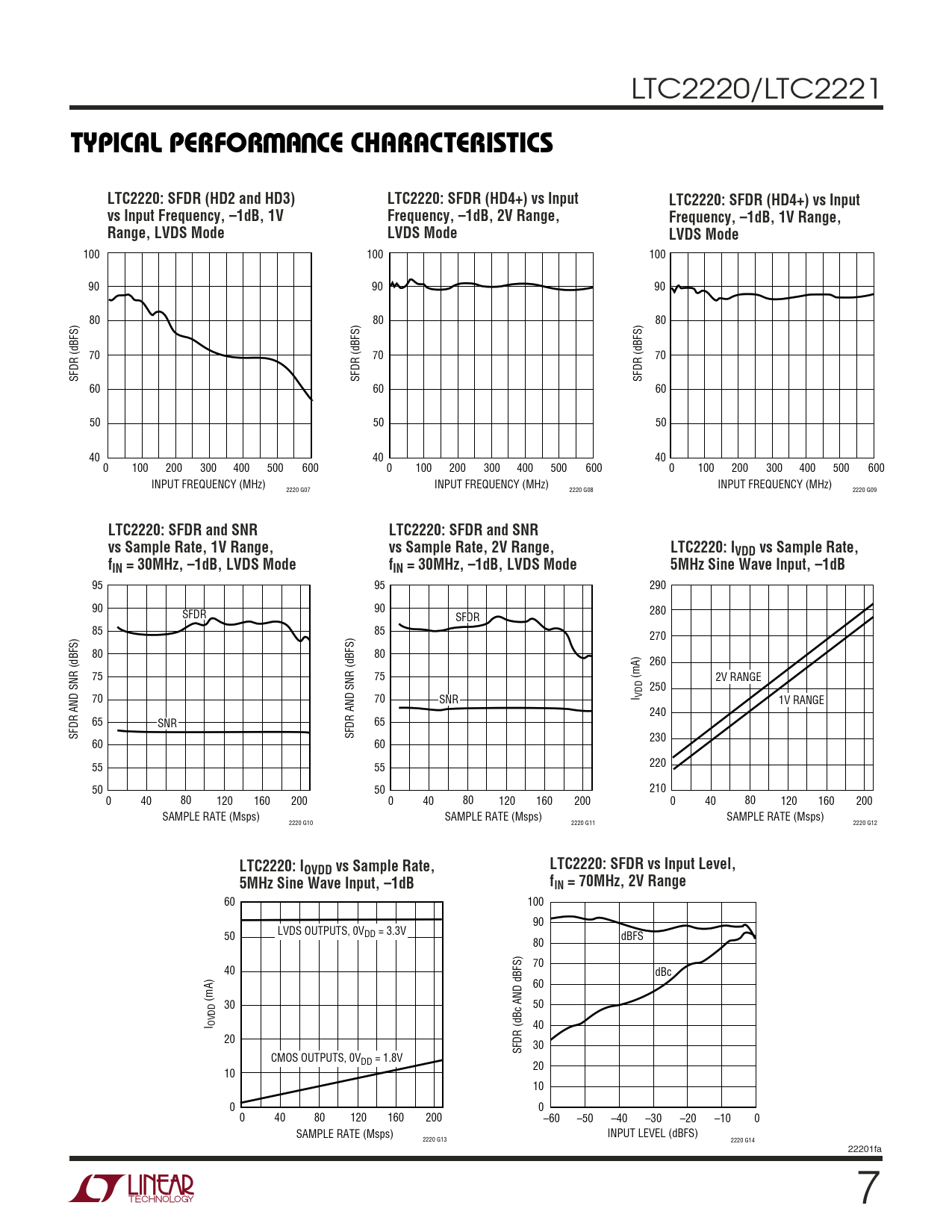 60 100 90 LVDS OUTPUTS, 0V 50 DD = 3.3V dBFS 80 70 40 dBc 60 (mA) 30 50 I OVDD 40 20 SFDR (dBc AND dBFS) 30 CMOS OUTPUTS, 0VDD = 1.8V 20 10 10 0 0 0 40 80 120 160 200 –60 –50 –40 –30 –20 –10 0 SAMPLE RATE (Msps) INPUT LEVEL (dBFS) 2220 G13 2220 G14 22201fa 7