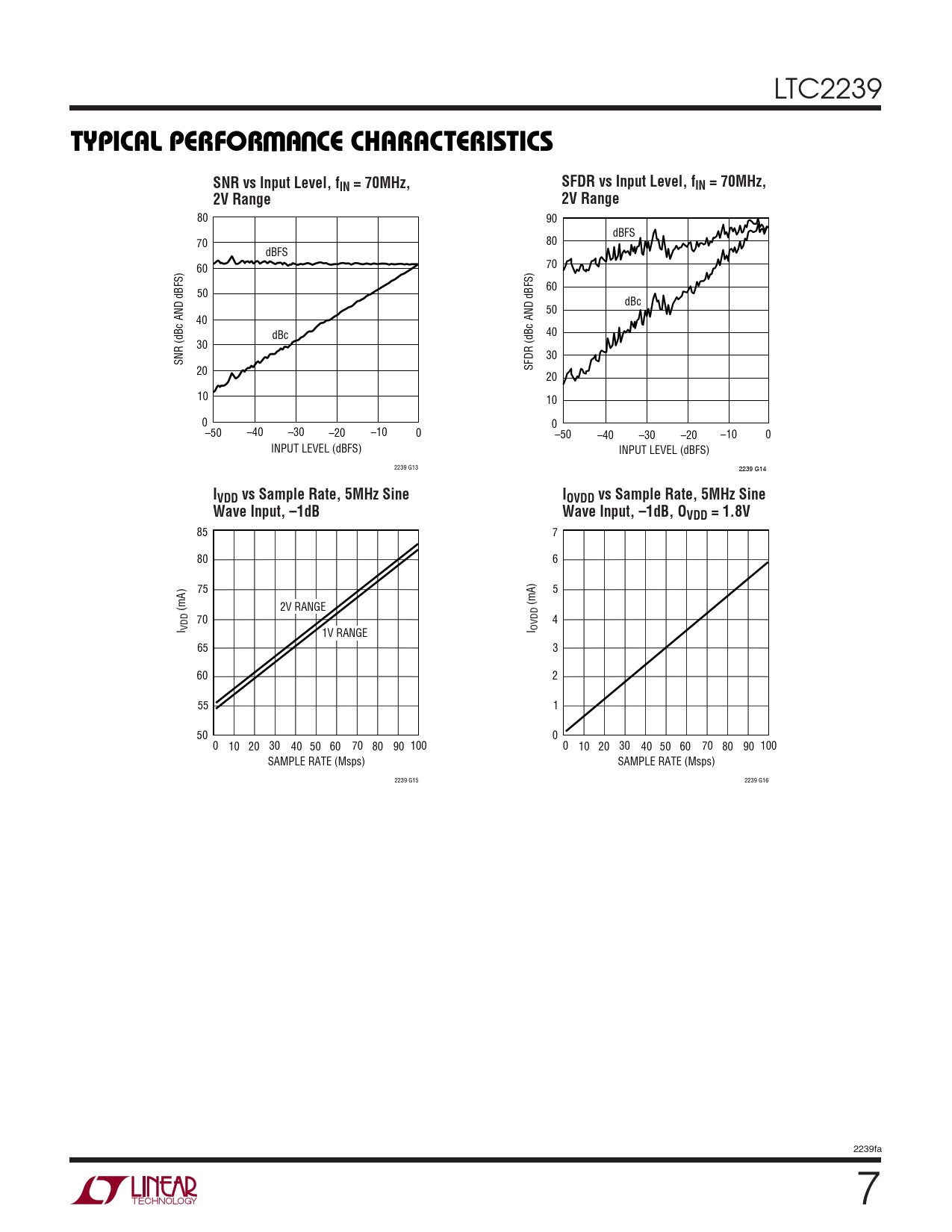 85 7 80 6 75 5 (mA) (mA) 2V RANGE 70 4 I VDD 1V RANGE I OVDD 65 3 60 2 55 1 50 0 0 10 20 30 40 50 60 70 80 90 100 0 10 20 30 40 50 60 70 80 90 100 SAMPLE RATE (Msps) SAMPLE RATE (Msps) 2239 G15 2239 G16 2239fa 7