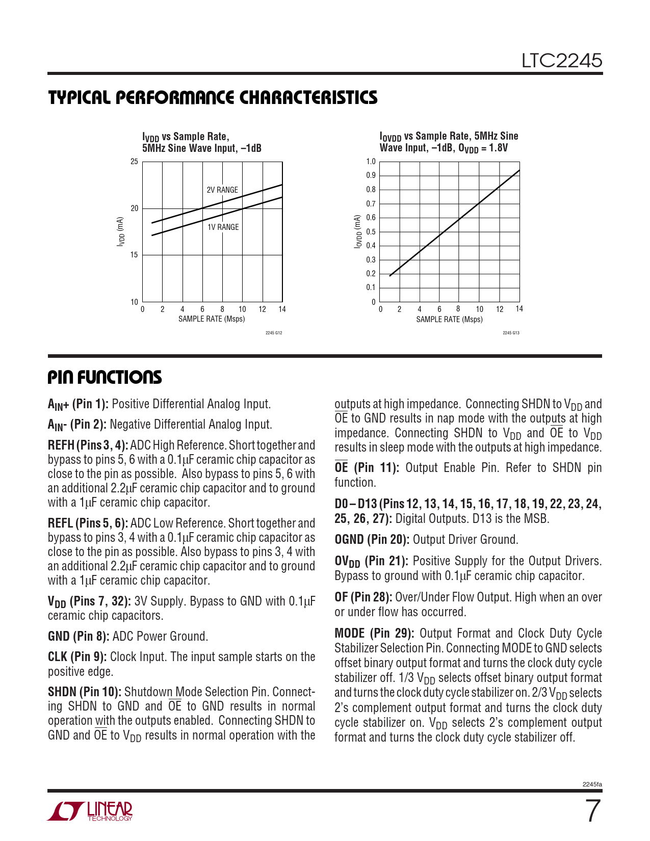 LTC2245 WUTYPICAL PERFOR A CE CHARACTERISTICSIIVDD vs Sample Rate,OVDD vs Sample Rate, 5MHz Sine5MHz Sine Wave Input, –1dBWave Input, –1dB, OVDD = 1.8V 25 1.0 0.9 2V RANGE 0.8 0.7 20 0.6 1V RANGE (mA) (mA) 0.5 I VDD I OVDD 0.4 15 0.3 0.2 0.1 10 0 0 2 4 6 8 10 12 14 0 2 4 6 8 10 12 14 SAMPLE RATE (Msps) SAMPLE RATE (Msps) 2245 G12 2245 G13 UUUPI FU CTIO SAIN+ (Pin 1): Positive Differential Analog Input. outputs at high impedance. Connecting SHDN to VDD and OE to GND results in nap mode with the outputs at high AIN- (Pin 2): Negative Differential Analog Input. impedance. Connecting SHDN to VDD and OE to VDD REFH (Pins 3, 4): ADC High Reference. Short together and results in sleep mode with the outputs at high impedance. bypass to pins 5, 6 with a 0.1µF ceramic chip capacitor as OE (Pin 11): Output Enable Pin. Refer to SHDN pin close to the pin as possible. Also bypass to pins 5, 6 with an additional 2.2µF ceramic chip capacitor and to ground function. with a 1µF ceramic chip capacitor. D0 – D13 (Pins 12, 13, 14, 15, 16, 17, 18, 19, 22, 23, 24,REFL (Pins 5, 6): ADC Low Reference. Short together and 25, 26, 27): Digital Outputs. D13 is the MSB. bypass to pins 3, 4 with a 0.1µF ceramic chip capacitor as OGND (Pin 20): Output Driver Ground. close to the pin as possible. Also bypass to pins 3, 4 with an additional 2.2µF ceramic chip capacitor and to ground OVDD (Pin 21): Positive Supply for the Output Drivers. with a 1µF ceramic chip capacitor. Bypass to ground with 0.1µF ceramic chip capacitor. VOF (Pin 28): Over/Under Flow Output. High when an over DD (Pins 7, 32): 3V Supply. Bypass to GND with 0.1µF ceramic chip capacitors. or under flow has occurred. GND (Pin 8): ADC Power Ground. MODE (Pin 29): Output Format and Clock Duty Cycle Stabilizer Selection Pin. Connecting MODE to GND selects CLK (Pin 9): Clock Input. The input sample starts on the offset binary output format and turns the clock duty cycle positive edge. stabilizer off. 1/3 VDD selects offset binary output format SHDN (Pin 10): Shutdown Mode Selection Pin. Connect- and turns the clock duty cycle stabilizer on. 2/3 VDD selects ing SHDN to GND and OE to GND results in normal 2’s complement output format and turns the clock duty operation with the outputs enabled. Connecting SHDN to cycle stabilizer on. VDD selects 2’s complement output GND and OE to VDD results in normal operation with the format and turns the clock duty cycle stabilizer off. 2245fa 7