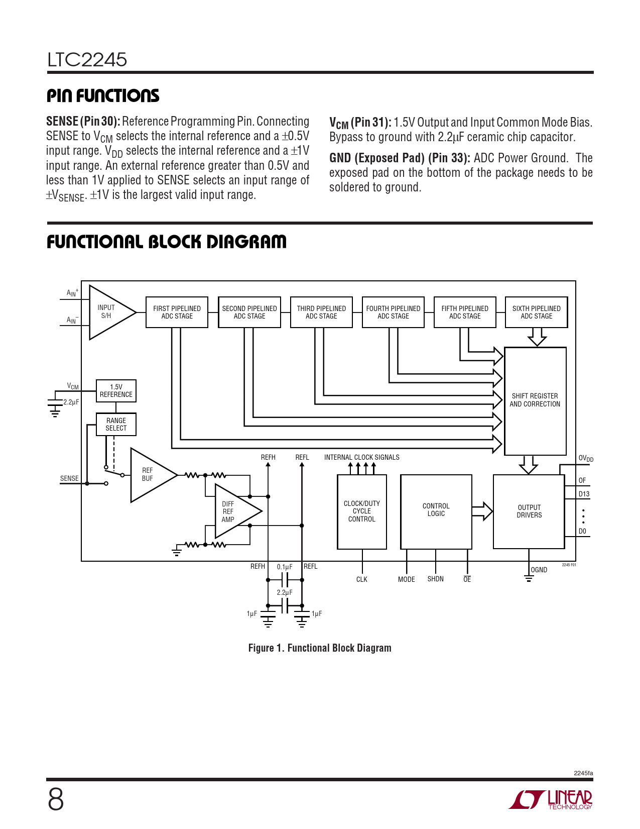 A + IN INPUT FIRST PIPELINED SECOND PIPELINED THIRD PIPELINED FOURTH PIPELINED FIFTH PIPELINED SIXTH PIPELINED – S/H ADC STAGE ADC STAGE ADC STAGE ADC STAGE ADC STAGE ADC STAGE AIN VCM 1.5V REFERENCE SHIFT REGISTER 2.2µF AND CORRECTION RANGE SELECT REFH REFL INTERNAL CLOCK SIGNALS OVDD REF SENSE BUF OF D13 DIFF CLOCK/DUTY CONTROL OUTPUT REF CYCLE LOGIC • DRIVERS AMP CONTROL • • D0 REFH 0.1µF REFL 2245 F01 OGND CLK MODE SHDN OE 2.2µF 1µF 1µF