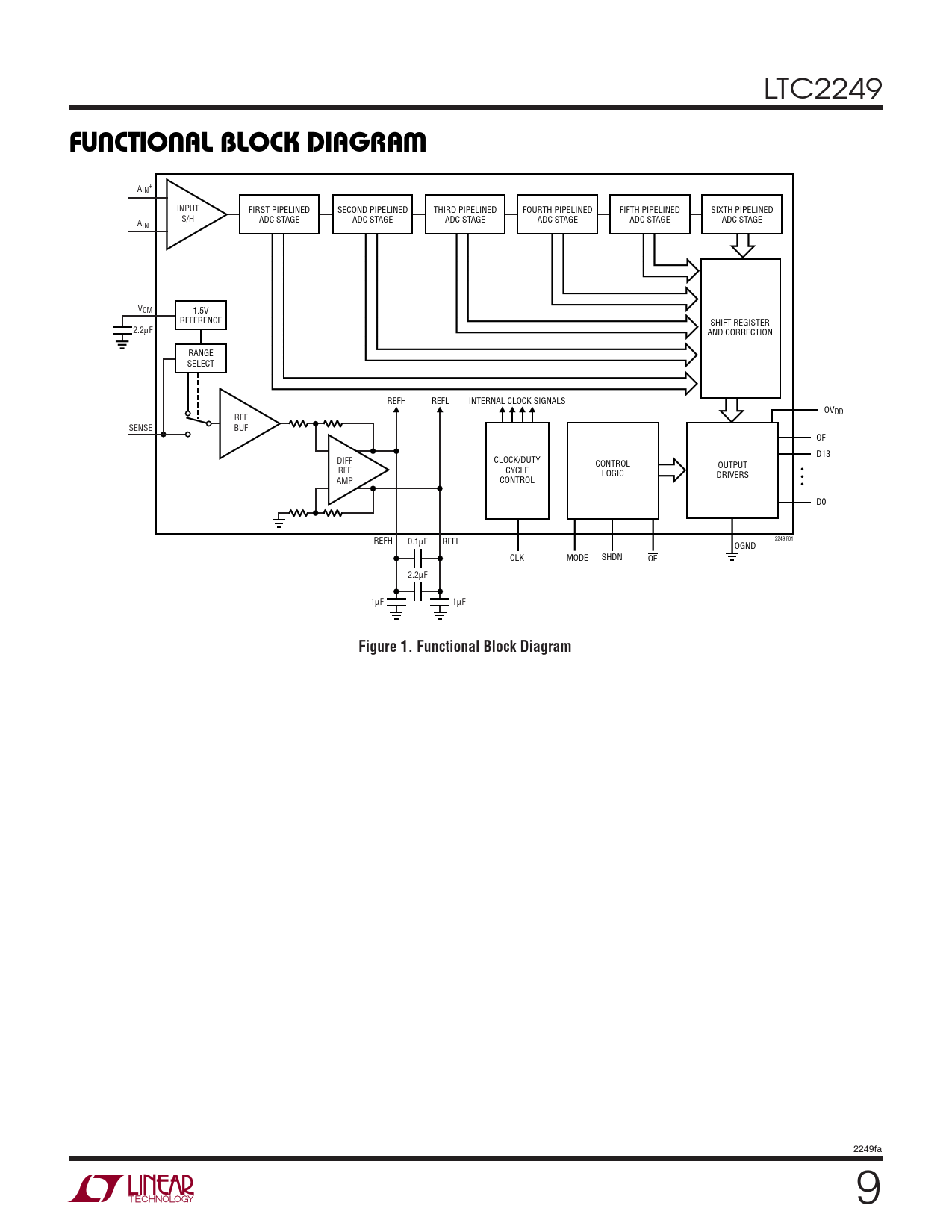 A + IN INPUT FIRST PIPELINED SECOND PIPELINED THIRD PIPELINED FOURTH PIPELINED FIFTH PIPELINED SIXTH PIPELINED – S/H ADC STAGE ADC STAGE ADC STAGE ADC STAGE ADC STAGE ADC STAGE AIN VCM 1.5V REFERENCE SHIFT REGISTER 2.2µF AND CORRECTION RANGE SELECT REFH REFL INTERNAL CLOCK SIGNALS OVDD REF SENSE BUF OF D13 DIFF CLOCK/DUTY CONTROL OUTPUT REF CYCLE LOGIC • DRIVERS AMP CONTROL • • D0 REFH 0.1µF REFL 2249 F01 OGND CLK MODE SHDN OE 2.2µF 1µF 1µF