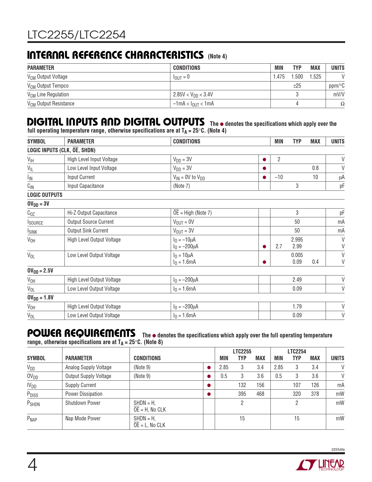 LTC2255/LTC2254 UUUI TER AL REFERE CE CHARACTERISTICS (Note 4)PARAMETERCONDITIONSMINTYPMAXUNITS VCM Output Voltage IOUT = 0 1.475 1.500 1.525 V VCM Output Tempco ±25 ppm/°C VCM Line Regulation 2.85V < VDD < 3.4V 3 mV/V VCM Output Resistance –1mA < IOUT < 1mA 4 Ω UUDIGITAL I PUTS A D DIGITAL OUTPUTS The ● denotes the specifications which apply over thefull operating temperature range, otherwise specifications are at TA = 25 ° C. (Note 4)SYMBOLPARAMETERCONDITIONSMINTYPMAXUNITSLOGIC INPUTS (CLK, OE, SHDN) VIH High Level Input Voltage VDD = 3V ● 2 V VIL Low Level Input Voltage VDD = 3V ● 0.8 V IIN Input Current VIN = 0V to VDD ● –10 10 µA CIN Input Capacitance (Note 7) 3 pF LOGIC OUTPUTSOVDD = 3V COZ Hi-Z Output Capacitance OE = High (Note 7) 3 pF ISOURCE Output Source Current VOUT = 0V 50 mA ISINK Output Sink Current VOUT = 3V 50 mA VOH High Level Output Voltage IO = –10µA 2.995 V IO = –200µA ● 2.7 2.99 V VOL Low Level Output Voltage IO = 10µA 0.005 V IO = 1.6mA ● 0.09 0.4 V OVDD = 2.5V VOH High Level Output Voltage IO = –200µA 2.49 V VOL Low Level Output Voltage IO = 1.6mA 0.09 V OVDD = 1.8V VOH High Level Output Voltage IO = –200µA 1.79 V VOL Low Level Output Voltage IO = 1.6mA 0.09 V WUPOWER REQUIRE E TS The ● denotes the specifications which apply over the full operating temperaturerange, otherwise specifications are at TA = 25 ° C. (Note 8)LTC2255LTC2254SYMBOLPARAMETERCONDITIONSMINTYPMAXMINTYPMAXUNITS VDD Analog Supply Voltage (Note 9) ● 2.85 3 3.4 2.85 3 3.4 V OVDD Output Supply Voltage (Note 9) ● 0.5 3 3.6 0.5 3 3.6 V IVDD Supply Current ● 132 156 107 126 mA PDISS Power Dissipation ● 395 468 320 378 mW PSHDN Shutdown Power SHDN = H, 2 2 mW OE = H, No CLK PNAP Nap Mode Power SHDN = H, 15 15 mW OE = L, No CLK 22554fa 4