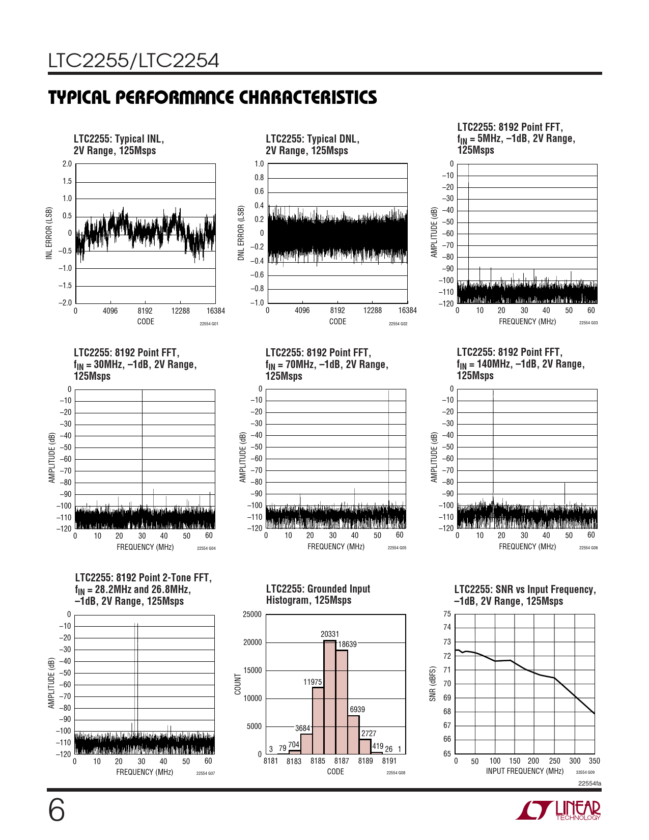 W U TYPICAL PERFOR A CE CHARACTERISTICS LTC2255: 8192 Point FFT, LTC2255: Typical INL, LTC2255: Typical DNL, fIN = 5MHz, –1dB, 2V Range, 2V Range, 125Msps 2V Range, 125Msps 125Msps