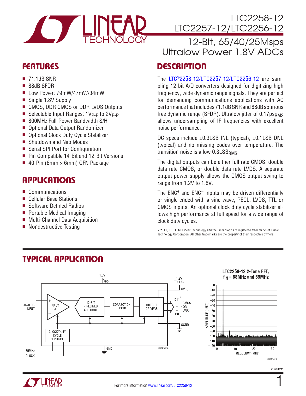 LTC2258-12 LTC2257-12/LTC2256-12 12-Bit, 65/40/25Msps Ultralow Power 1.8V ADCs FeaTuresDescripTion n 71.1dB SNR The LTC®2258-12/LTC2257-12/LTC2256-12 are sam- n 88dB SFDR pling 12-bit A/D converters designed for digitizing high n Low Power: 79mW/47mW/34mW frequency, wide dynamic range signals. They are perfect n Single 1.8V Supply for demanding communications applications with AC n CMOS, DDR CMOS or DDR LVDS Outputs performance that includes 71.1dB SNR and 88dB spurious n Selectable Input Ranges: 1VP-P to 2VP-P free dynamic range (SFDR). Ultralow jitter of 0.17psRMS n 800MHz Full-Power Bandwidth S/H allows undersampling of IF frequencies with excellent n Optional Data Output Randomizer noise performance. n Optional Clock Duty Cycle Stabilizer DC specs include ±0.3LSB INL (typical), ±0.1LSB DNL n Shutdown and Nap Modes (typical) and no missing codes over temperature. The n Serial SPI Port for Configuration transition noise is a low 0.3LSBRMS. n Pin Compatible 14-Bit and 12-Bit Versions n 40-Pin (6mm × 6mm) QFN Package The digital outputs can be either full rate CMOS, double data rate CMOS, or double data rate LVDS. A separate applicaTions output power supply allows the CMOS output swing to range from 1.2V to 1.8V. n Communications The ENC+ and ENC– inputs may be driven differentially n Cellular Base Stations or single-ended with a sine wave, PECL, LVDS, TTL or n Software Defined Radios CMOS inputs. An optional clock duty cycle stabilizer al- n Portable Medical Imaging lows high performance at full speed for a wide range of n Multi-Channel Data Acquisition clock duty cycles. n Nondestructive Testing L, LT, LTC, LTM, Linear Technology and the Linear logo are registered trademarks of Linear Technology Corporation. All other trademarks are the property of their respective owners. Typical applicaTionLTC2258-12 2-Tone FFT, 1.8V 1.2V fIN = 68MHz and 69MHz VDD TO 1.8V 0 OVDD –10 –20 + D11 –30 12-BIT • ANALOG CMOS INPUT CORRECTION OUTPUT PIPELINED • –40 INPUT OR S/H LOGIC DRIVERS ADC CORE – • LVDS –50 D0 –60 –70 OGND AMPLITUDE (dBFS) –80 CLOCK/DUTY –90 CYCLE –100 CONTROL –110 –120 225812 TA01a GND 65MHz 0 10 20 30 FREQUENCY (MHz) CLOCK 225812 TA01b 225812fd For more information www.linear.com/LTC2258-12 1 Document Outline Features Description Applications Typical Application Absolute Maximum Ratings Pin Configurations Order Information Converter Characteristics Analog Input Dynamic Accuracy Internal Reference Characteristics Digital Inputs And Outputs Power Requirements Timing Characteristics Timing Diagrams Typical Performance Characteristics Pin Functions Functional Block Diagram Applications Information Typical Applications Package Description Revision History Related Parts