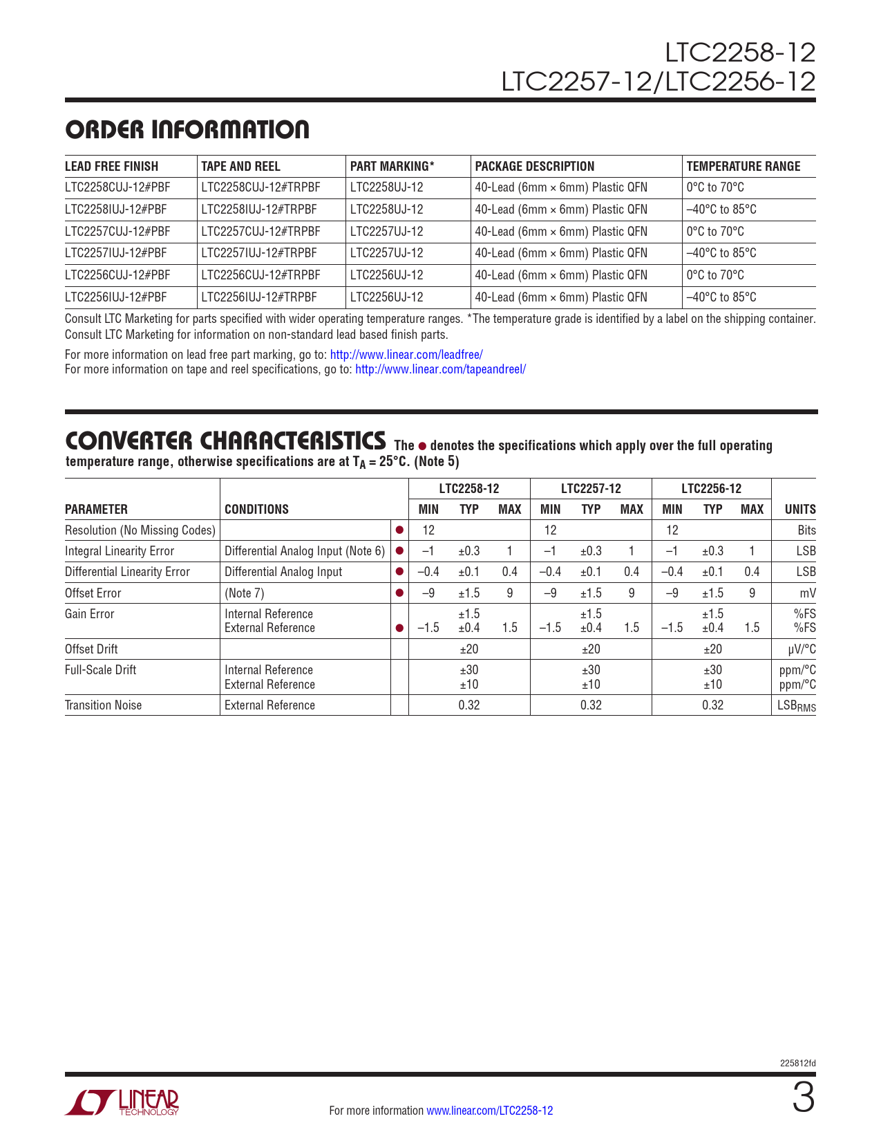 LTC2258-12 LTC2257-12/LTC2256-12 orDer inForMaTion LEAD FREE FINISHTAPE AND REELPART MARKING*PACKAGE DESCRIPTIONTEMPERATURE RANGE LTC2258CUJ-12#PBF LTC2258CUJ-12#TRPBF LTC2258UJ-12 40-Lead (6mm × 6mm) Plastic QFN 0°C to 70°C LTC2258IUJ-12#PBF LTC2258IUJ-12#TRPBF LTC2258UJ-12 40-Lead (6mm × 6mm) Plastic QFN –40°C to 85°C LTC2257CUJ-12#PBF LTC2257CUJ-12#TRPBF LTC2257UJ-12 40-Lead (6mm × 6mm) Plastic QFN 0°C to 70°C LTC2257IUJ-12#PBF LTC2257IUJ-12#TRPBF LTC2257UJ-12 40-Lead (6mm × 6mm) Plastic QFN –40°C to 85°C LTC2256CUJ-12#PBF LTC2256CUJ-12#TRPBF LTC2256UJ-12 40-Lead (6mm × 6mm) Plastic QFN 0°C to 70°C LTC2256IUJ-12#PBF LTC2256IUJ-12#TRPBF LTC2256UJ-12 40-Lead (6mm × 6mm) Plastic QFN –40°C to 85°C Consult LTC Marketing for parts specified with wider operating temperature ranges. *The temperature grade is identified by a label on the shipping container. Consult LTC Marketing for information on non-standard lead based finish parts. For more information on lead free part marking, go to: http://www.linear.com/leadfree/ For more information on tape and reel specifications, go to: http://www.linear.com/tapeandreel/ c onverTer characTerisTics The l denotes the specifications which apply over the full operatingtemperature range, otherwise specifications are at TA = 25°C. (Note 5)LTC2258-12LTC2257-12LTC2256-12PARAMETERCONDITIONSMINTYPMAXMINTYPMAXMINTYPMAXUNITS Resolution (No Missing Codes) l 12 12 12 Bits Integral Linearity Error Differential Analog Input (Note 6) l –1 ±0.3 1 –1 ±0.3 1 –1 ±0.3 1 LSB Differential Linearity Error Differential Analog Input l –0.4 ±0.1 0.4 –0.4 ±0.1 0.4 –0.4 ±0.1 0.4 LSB Offset Error (Note 7) l –9 ±1.5 9 –9 ±1.5 9 –9 ±1.5 9 mV Gain Error Internal Reference ±1.5 ±1.5 ±1.5 %FS External Reference l –1.5 ±0.4 1.5 –1.5 ±0.4 1.5 –1.5 ±0.4 1.5 %FS Offset Drift ±20 ±20 ±20 µV/°C Full-Scale Drift Internal Reference ±30 ±30 ±30 ppm/°C External Reference ±10 ±10 ±10 ppm/°C Transition Noise External Reference 0.32 0.32 0.32 LSBRMS 225812fd For more information www.linear.com/LTC2258-12 3 Document Outline Features Description Applications Typical Application Absolute Maximum Ratings Pin Configurations Order Information Converter Characteristics Analog Input Dynamic Accuracy Internal Reference Characteristics Digital Inputs And Outputs Power Requirements Timing Characteristics Timing Diagrams Typical Performance Characteristics Pin Functions Functional Block Diagram Applications Information Typical Applications Package Description Revision History Related Parts
