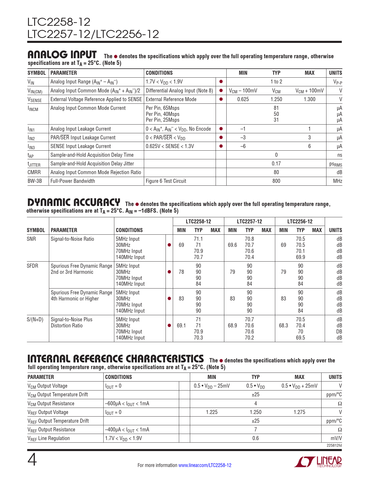 LTC2258-12 LTC2257-12/LTC2256-12 a nalog inpuT The l denotes the specifications which apply over the full operating temperature range, otherwisespecifications are at TA = 25°C. (Note 5)SYMBOL PARAMETERCONDITIONSMINTYPMAXUNITS V + – IN Analog Input Range (AIN – AIN ) 1.7V < VDD < 1.9V l 1 to 2 VP-P V + – IN(CM) Analog Input Common Mode (AIN + AIN )/2 Differential Analog Input (Note 8) l VCM – 100mV VCM VCM + 100mV V VSENSE External Voltage Reference Applied to SENSE External Reference Mode l 0.625 1.250 1.300 V IINCM Analog Input Common Mode Current Per Pin, 65Msps 81 µA Per Pin, 40Msps 50 µA Per Pin, 25Msps 31 µA I + – IN1 Analog Input Leakage Current 0 < AIN , AIN < VDD, No Encode l –1 1 µA IIN2 PAR/SER Input Leakage Current 0 < PAR/SER < VDD l –3 3 µA IIN3 SENSE Input Leakage Current 0.625V < SENSE < 1.3V l –6 6 µA tAP Sample-and-Hold Acquisition Delay Time 0 ns tJITTER Sample-and-Hold Acquisition Delay Jitter 0.17 psRMS CMRR Analog Input Common Mode Rejection Ratio 80 dB BW-3B Full-Power Bandwidth Figure 6 Test Circuit 800 MHz DynaMic accuracy The l denotes the specifications which apply over the full operating temperature range,otherwise specifications are at TA = 25°C. AIN = –1dBFS. (Note 5)LTC2258-12LTC2257-12LTC2256-12SYMBOL PARAMETERCONDITIONSMINTYPMAXMINTYPMAXMINTYPMAXUNITS SNR Signal-to-Noise Ratio 5MHz Input 71.1 70.8 70.5 dB 30MHz l 69 71 69.6 70.7 69 70.5 dB 70MHz Input 70.9 70.6 70.1 dB 140MHz Input 70.7 70.4 69.9 dB SFDR Spurious Free Dynamic Range 5MHz Input 90 90 90 dB 2nd or 3rd Harmonic 30MHz l 78 90 79 90 79 90 dB 70MHz Input 90 90 90 dB 140MHz Input 84 84 84 dB Spurious Free Dynamic Range 5MHz Input 90 90 90 dB 4th Harmonic or Higher 30MHz l 83 90 83 90 83 90 dB 70MHz Input 90 90 90 dB 140MHz Input 90 90 84 dB S/(N+D) Signal-to-Noise Plus 5MHz Input 71 70.7 70.5 dB Distortion Ratio 30MHz l 69.1 71 68.9 70.6 68.3 70.4 dB 70MHz Input 70.9 70.6 70 DB 140MHz Input 70.3 70.2 69.5 dB i nTernal reFerence characTerisTics The l denotes the specifications which apply over thefull operating temperature range, otherwise specifications are at TA = 25°C. (Note 5)PARAMETERCONDITIONSMINTYPMAXUNITS VCM Output Voltage IOUT = 0 0.5 • VDD – 25mV 0.5 • VDD 0.5 • VDD + 25mV V VCM Output Temperature Drift ±25 ppm/°C VCM Output Resistance –600µA < IOUT < 1mA 4 Ω VREF Output Voltage IOUT = 0 1.225 1.250 1.275 V VREF Output Temperature Drift ±25 ppm/°C VREF Output Resistance –400µA < IOUT < 1mA 7 Ω VREF Line Regulation 1.7V < VDD < 1.9V 0.6 mV/V 225812fd 4 For more information www.linear.com/LTC2258-12 Document Outline Features Description Applications Typical Application Absolute Maximum Ratings Pin Configurations Order Information Converter Characteristics Analog Input Dynamic Accuracy Internal Reference Characteristics Digital Inputs And Outputs Power Requirements Timing Characteristics Timing Diagrams Typical Performance Characteristics Pin Functions Functional Block Diagram Applications Information Typical Applications Package Description Revision History Related Parts