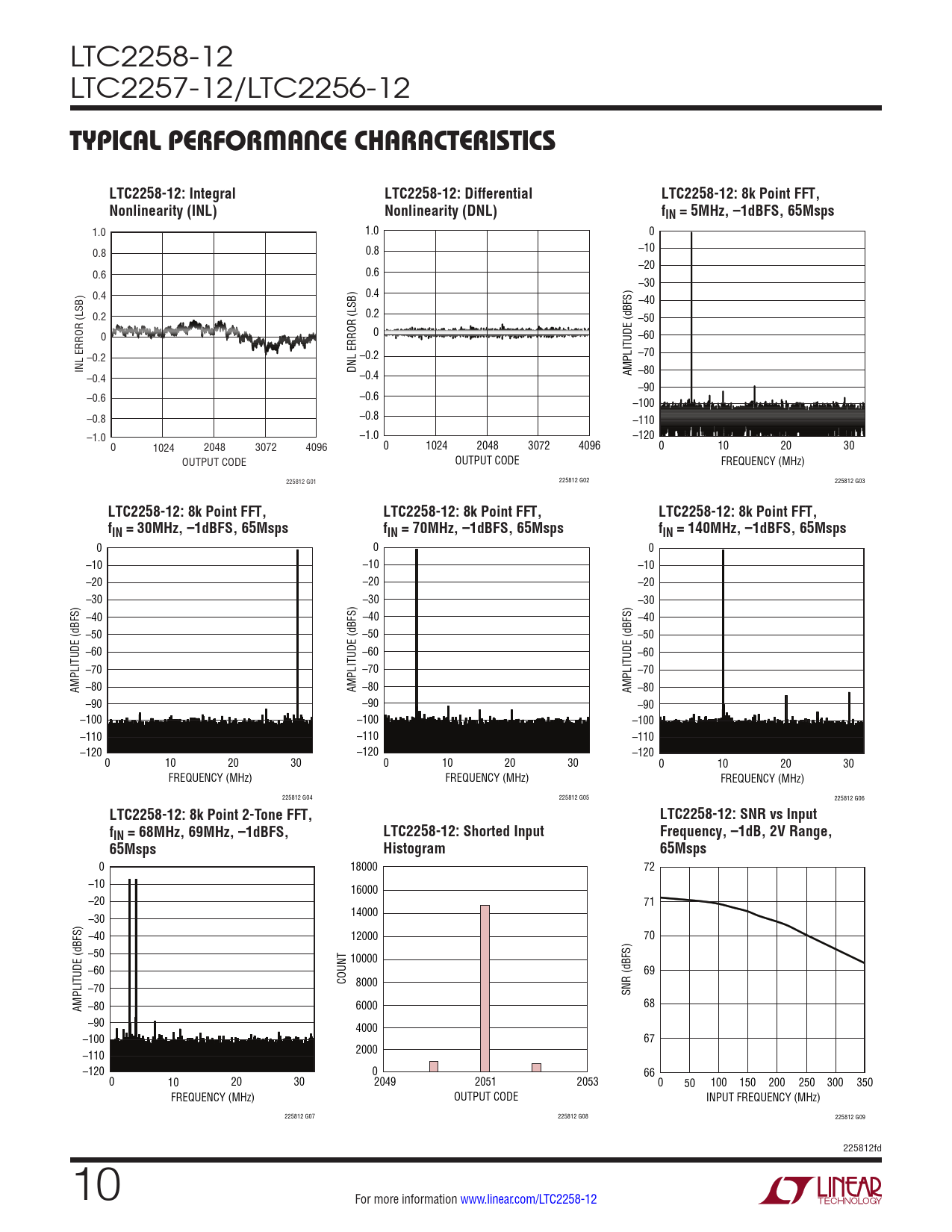 Typical perForMance characTerisTics LTC2258-12: Integral LTC2258-12: Differential LTC2258-12: 8k Point FFT, Nonlinearity (INL) Nonlinearity (DNL) fIN = 5MHz, –1dBFS, 65Msps
