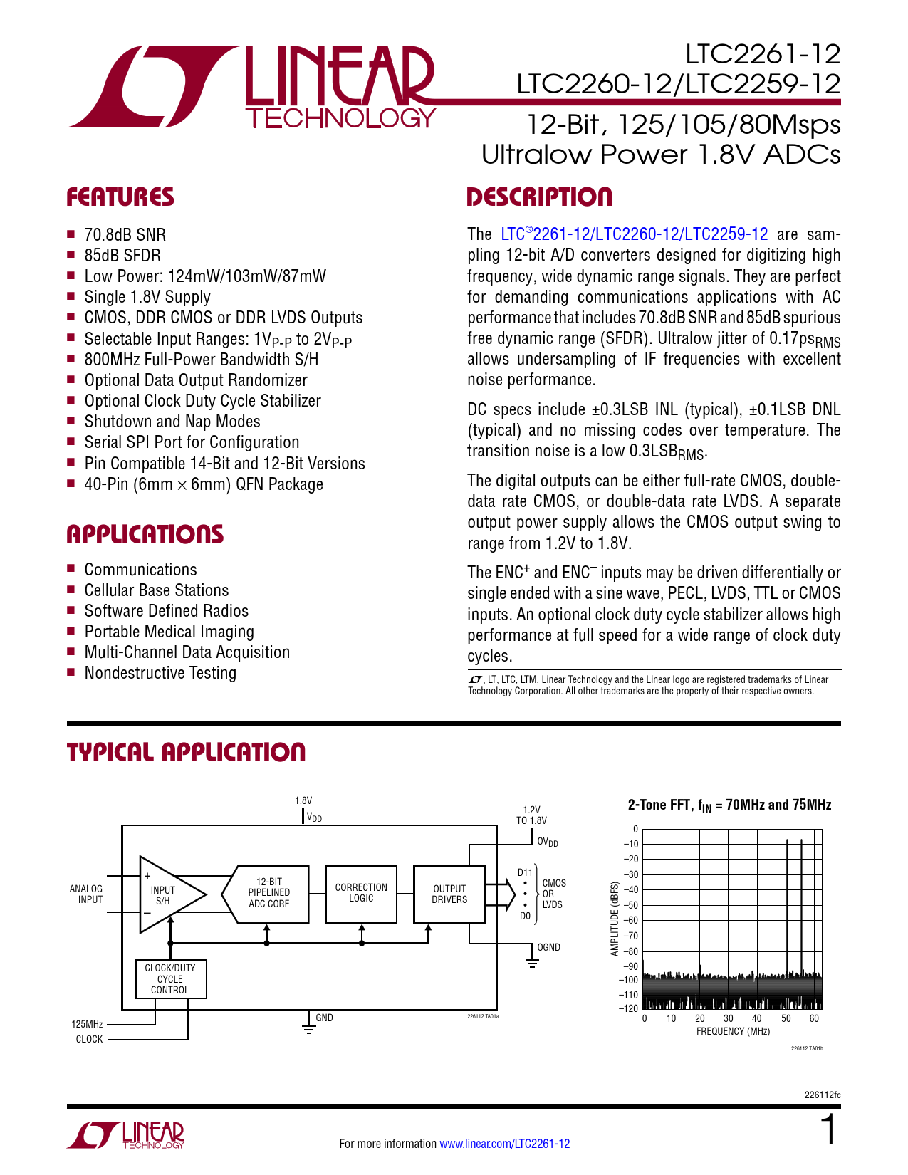 LTC2261-12 LTC2260-12/LTC2259-12 12-Bit, 125/105/80Msps Ultralow Power 1.8V ADCs FeaTuresDescripTion n 70.8dB SNR The LTC®2261-12/LTC2260-12/LTC2259-12 are sam- n 85dB SFDR pling 12-bit A/D converters designed for digitizing high n Low Power: 124mW/103mW/87mW frequency, wide dynamic range signals. They are perfect n Single 1.8V Supply for demanding communications applications with AC n CMOS, DDR CMOS or DDR LVDS Outputs performance that includes 70.8dB SNR and 85dB spurious n Selectable Input Ranges: 1VP-P to 2VP-P free dynamic range (SFDR). Ultralow jitter of 0.17psRMS n 800MHz Full-Power Bandwidth S/H allows undersampling of IF frequencies with excellent n Optional Data Output Randomizer noise performance. n Optional Clock Duty Cycle Stabilizer DC specs include ±0.3LSB INL (typical), ±0.1LSB DNL n Shutdown and Nap Modes (typical) and no missing codes over temperature. The n Serial SPI Port for Configuration transition noise is a low 0.3LSBRMS. n Pin Compatible 14-Bit and 12-Bit Versions n 40-Pin (6mm × 6mm) QFN Package The digital outputs can be either full-rate CMOS, double- data rate CMOS, or double-data rate LVDS. A separate applicaTions output power supply allows the CMOS output swing to range from 1.2V to 1.8V. n Communications The ENC+ and ENC– inputs may be driven differentially or n Cellular Base Stations single ended with a sine wave, PECL, LVDS, TTL or CMOS n Software Defined Radios inputs. An optional clock duty cycle stabilizer allows high n Portable Medical Imaging performance at full speed for a wide range of clock duty n Multi-Channel Data Acquisition cycles. n Nondestructive Testing L, LT, LTC, LTM, Linear Technology and the Linear logo are registered trademarks of Linear Technology Corporation. All other trademarks are the property of their respective owners. Typical applicaTion 1.8V 1.2V 2-Tone FFT, fIN = 70MHz and 75MHz VDD TO 1.8V 0 OVDD –10 –20 + D11 –30 12-BIT • ANALOG CMOS INPUT CORRECTION OUTPUT PIPELINED • –40 INPUT OR S/H LOGIC DRIVERS ADC CORE – • LVDS –50 D0 –60 –70 OGND AMPLITUDE (dBFS) –80 CLOCK/DUTY –90 CYCLE –100 CONTROL –110 –120 226112 TA01a GND 0 10 20 30 40 50 60 125MHz FREQUENCY (MHz) CLOCK 226112 TA01b 226112fc For more information www.linear.com/LTC2261-12 1 Document Outline Features Description Applications Typical Application Absolute Maximum Ratings Pin Configurations Order Information Converter Characteristics Analog Input Dynamic Accuracy Internal Reference Characteristics Digital Inputs and Outputs Power Requirements Timing Characteristics Timing Diagrams Typical Performance Characteristics Pin Functions Functional Block Diagram Applications Information Typical Applications Package Description Revision History Related Parts