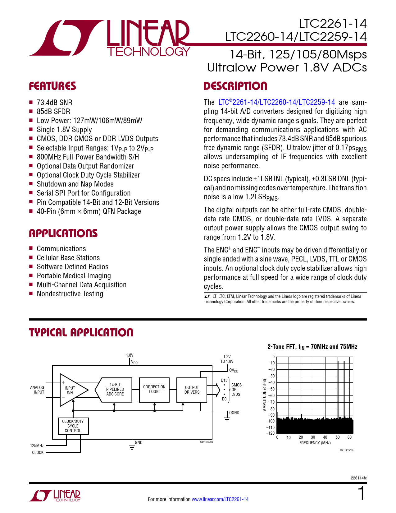 LTC2261-14 LTC2260-14/LTC2259-14 14-Bit, 125/105/80Msps Ultralow Power 1.8V ADCs FeaTuresDescripTion n 73.4dB SNR The LTC®2261-14/LTC2260-14/LTC2259-14 are sam- n 85dB SFDR pling 14-bit A/D converters designed for digitizing high n Low Power: 127mW/106mW/89mW frequency, wide dynamic range signals. They are perfect n Single 1.8V Supply for demanding communications applications with AC n CMOS, DDR CMOS or DDR LVDS Outputs performance that includes 73.4dB SNR and 85dB spurious n Selectable Input Ranges: 1VP-P to 2VP-P free dynamic range (SFDR). Ultralow jitter of 0.17psRMS n 800MHz Full-Power Bandwidth S/H allows undersampling of IF frequencies with excellent n Optional Data Output Randomizer noise performance. n Optional Clock Duty Cycle Stabilizer DC specs include ±1LSB INL (typical), ±0.3LSB DNL (typi- n Shutdown and Nap Modes cal) and no missing codes over temperature. The transition n Serial SPI Port for Configuration noise is a low 1.2LSBRMS. n Pin Compatible 14-Bit and 12-Bit Versions n 40-Pin (6mm × 6mm) QFN Package The digital outputs can be either full-rate CMOS, double- data rate CMOS, or double-data rate LVDS. A separate applicaTions output power supply allows the CMOS output swing to range from 1.2V to 1.8V. n Communications The ENC+ and ENC– inputs may be driven differentially or n Cellular Base Stations single ended with a sine wave, PECL, LVDS, TTL or CMOS n Software Defined Radios inputs. An optional clock duty cycle stabilizer allows high n Portable Medical Imaging performance at full speed for a wide range of clock duty n Multi-Channel Data Acquisition cycles. n Nondestructive Testing L, LT, LTC, LTM, Linear Technology and the Linear logo are registered trademarks of Linear Technology Corporation. All other trademarks are the property of their respective owners. Typical applicaTion2-Tone FFT, fIN = 70MHz and 75MHz 1.8V 1.2V 0 V TO 1.8V DD –10 OVDD –20 –30 + D13 14-BIT • –40 ANALOG CMOS INPUT CORRECTION OUTPUT PIPELINED • –50 INPUT OR S/H LOGIC DRIVERS ADC CORE – • LVDS –60 D0 –70 AMPLITUDE (dBFS) –80 OGND –90 CLOCK/DUTY –100 CYCLE –110 CONTROL –120 0 10 20 30 40 50 60 226114 TA01a GND FREQUENCY (MHz) 125MHz CLOCK 226114 TA01b 226114fc For more information www.linear.com/LTC2261-14 1 Document Outline Features Applications Description Typical Application Absolute Maximum Ratings Pin Configurations Order Information Converter Characteristics Analog Input Dynamic Accuracy Internal Reference Characteristics Digital Inputs and Outputs Power Requirements Timing Characteristics Timing Diagrams Typical Performance Characteristics Pin Functions Functional Block Diagram Applications Information Typical Applications Package Description Revision History Related Parts