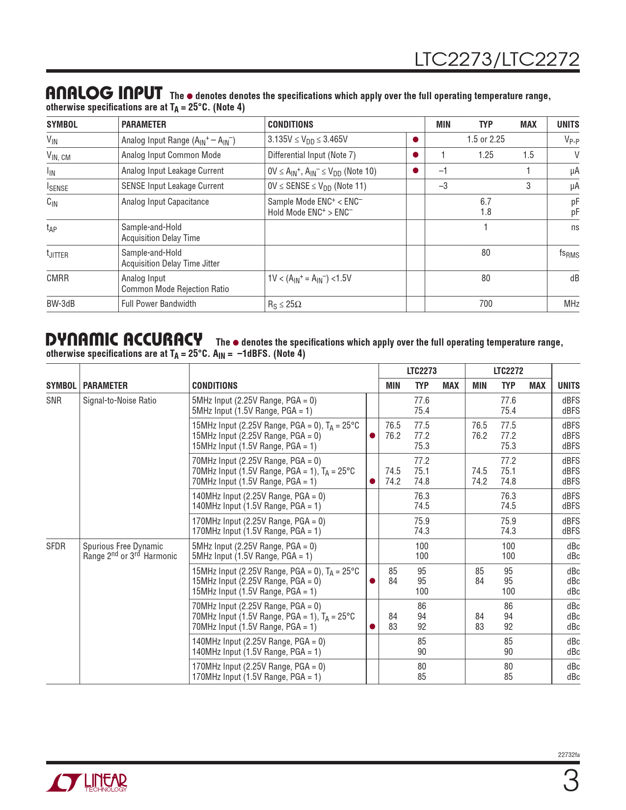 SNR Signal-to-Noise Ratio 5MHz Input (2.25V Range, PGA = 0) 77.6 77.6 dBFS 5MHz Input (1.5V Range, PGA = 1) 75.4 75.4 dBFS 15MHz Input (2.25V Range, PGA = 0), TA = 25°C 76.5 77.5 76.5 77.5 dBFS 15MHz Input (2.25V Range, PGA = 0) l 76.2 77.2 76.2 77.2 dBFS 15MHz Input (1.5V Range, PGA = 1) 75.3 75.3 dBFS 70MHz Input (2.25V Range, PGA = 0) 77.2 77.2 dBFS 70MHz Input (1.5V Range, PGA = 1), TA = 25°C 74.5 75.1 74.5 75.1 dBFS 70MHz Input (1.5V Range, PGA = 1) l 74.2 74.8 74.2 74.8 dBFS 140MHz Input (2.25V Range, PGA = 0) 76.3 76.3 dBFS 140MHz Input (1.5V Range, PGA = 1) 74.5 74.5 dBFS 170MHz Input (2.25V Range, PGA = 0) 75.9 75.9 dBFS 170MHz Input (1.5V Range, PGA = 1) 74.3 74.3 dBFS SFDR Spurious Free Dynamic 5MHz Input (2.25V Range, PGA = 0) 100 100 dBc Range 2nd or 3rd Harmonic 5MHz Input (1.5V Range, PGA = 1) 100 100 dBc 15MHz Input (2.25V Range, PGA = 0), TA = 25°C 85 95 85 95 dBc 15MHz Input (2.25V Range, PGA = 0) l 84 95 84 95 dBc 15MHz Input (1.5V Range, PGA = 1) 100 100 dBc 70MHz Input (2.25V Range, PGA = 0) 86 86 dBc 70MHz Input (1.5V Range, PGA = 1), TA = 25°C 84 94 84 94 dBc 70MHz Input (1.5V Range, PGA = 1) l 83 92 83 92 dBc 140MHz Input (2.25V Range, PGA = 0) 85 85 dBc 140MHz Input (1.5V Range, PGA = 1) 90 90 dBc 170MHz Input (2.25V Range, PGA = 0) 80 80 dBc 170MHz Input (1.5V Range, PGA = 1) 85 85 dBc 22732fa 3