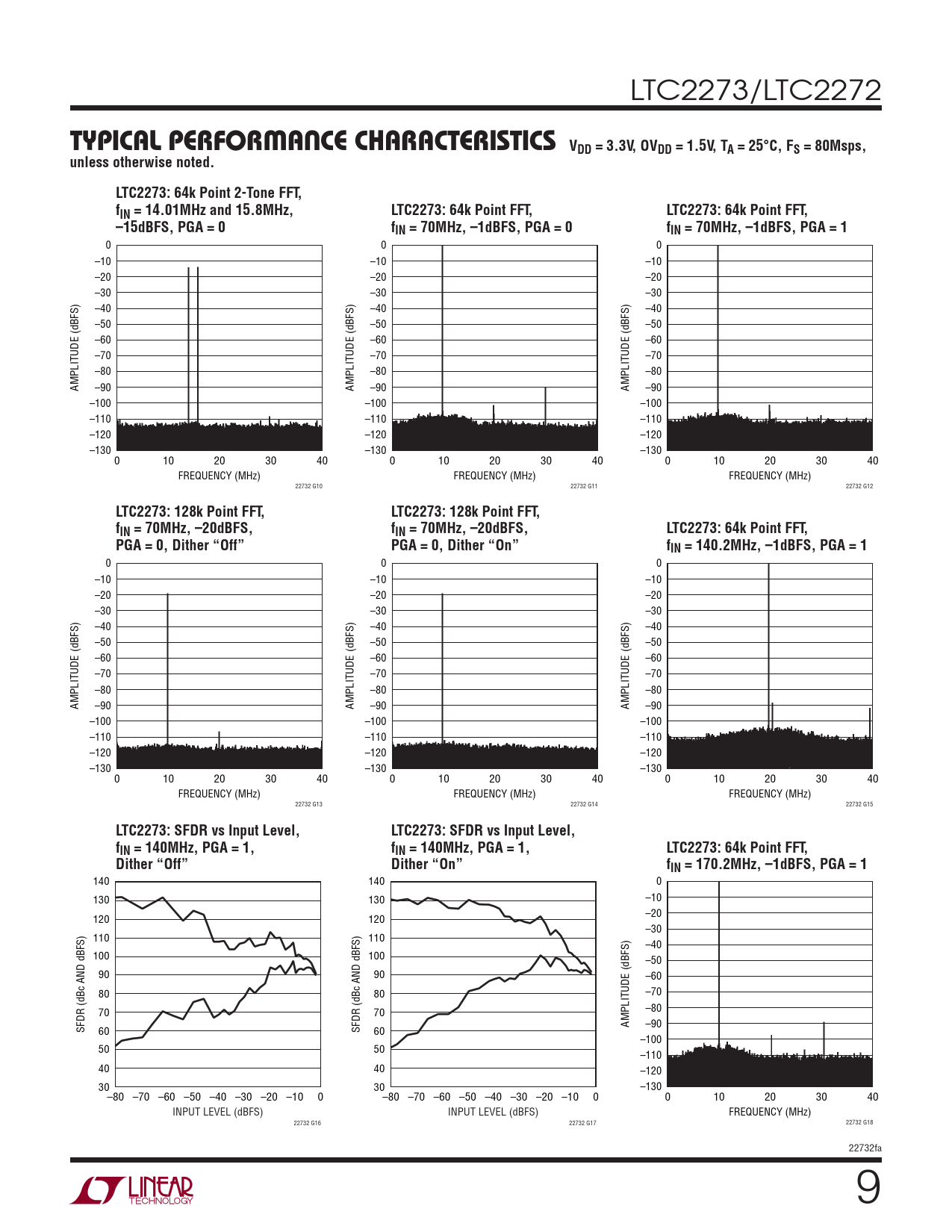 TYPICAL PERFORMANCE CHARACTERISTICS VDD = 3.3V, OVDD = 1.5V, TA = 25°C, FS = 80Msps, unless otherwise noted. LTC2273: 64k Point 2-Tone FFT, fIN = 14.01MHz and 15.8MHz, LTC2273: 64k Point FFT, LTC2273: 64k Point FFT, –15dBFS, PGA = 0 fIN = 70MHz, –1dBFS, PGA = 0 fIN = 70MHz, –1dBFS, PGA = 1