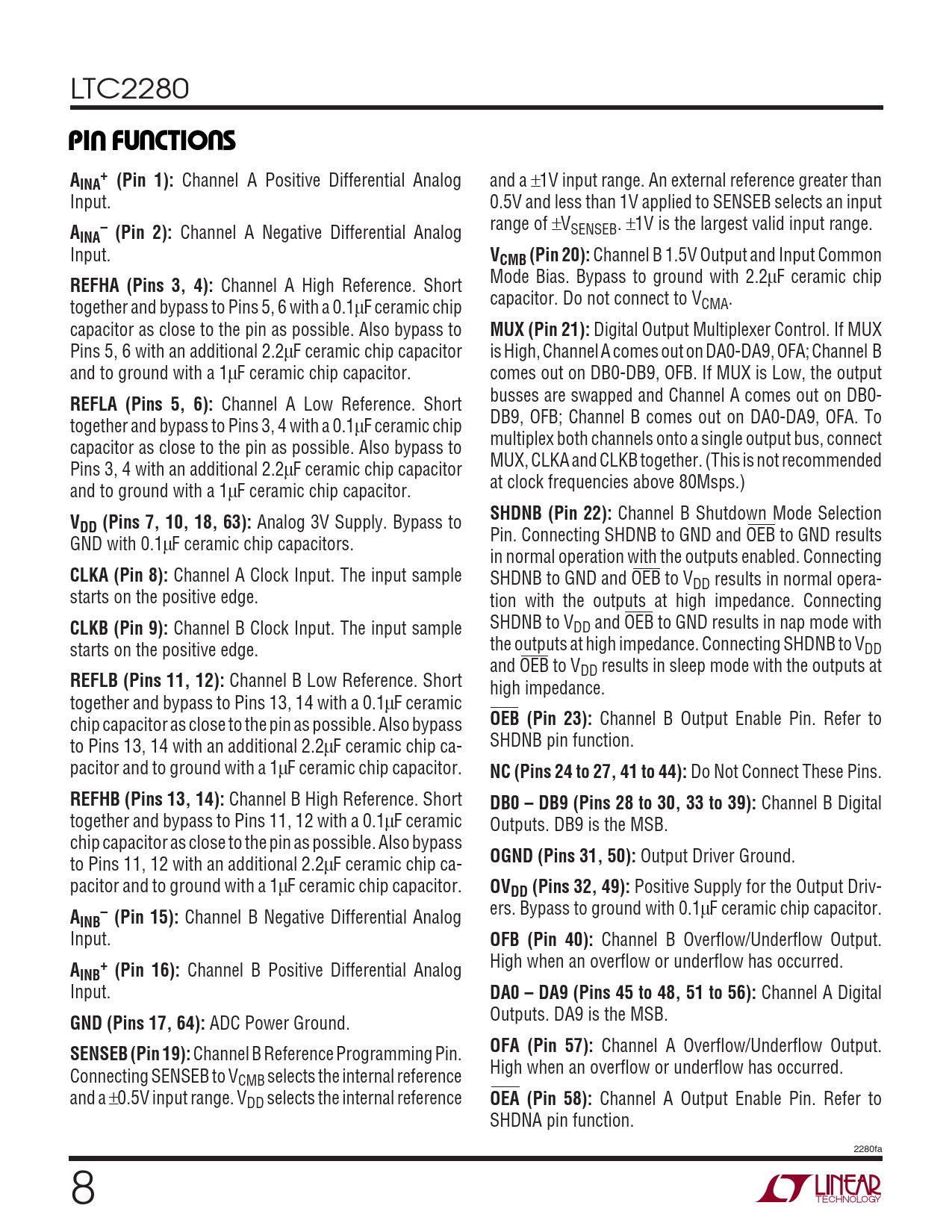 Channel A Output Enable Pin. Refer to SHDNA pin function. 2280fa 8