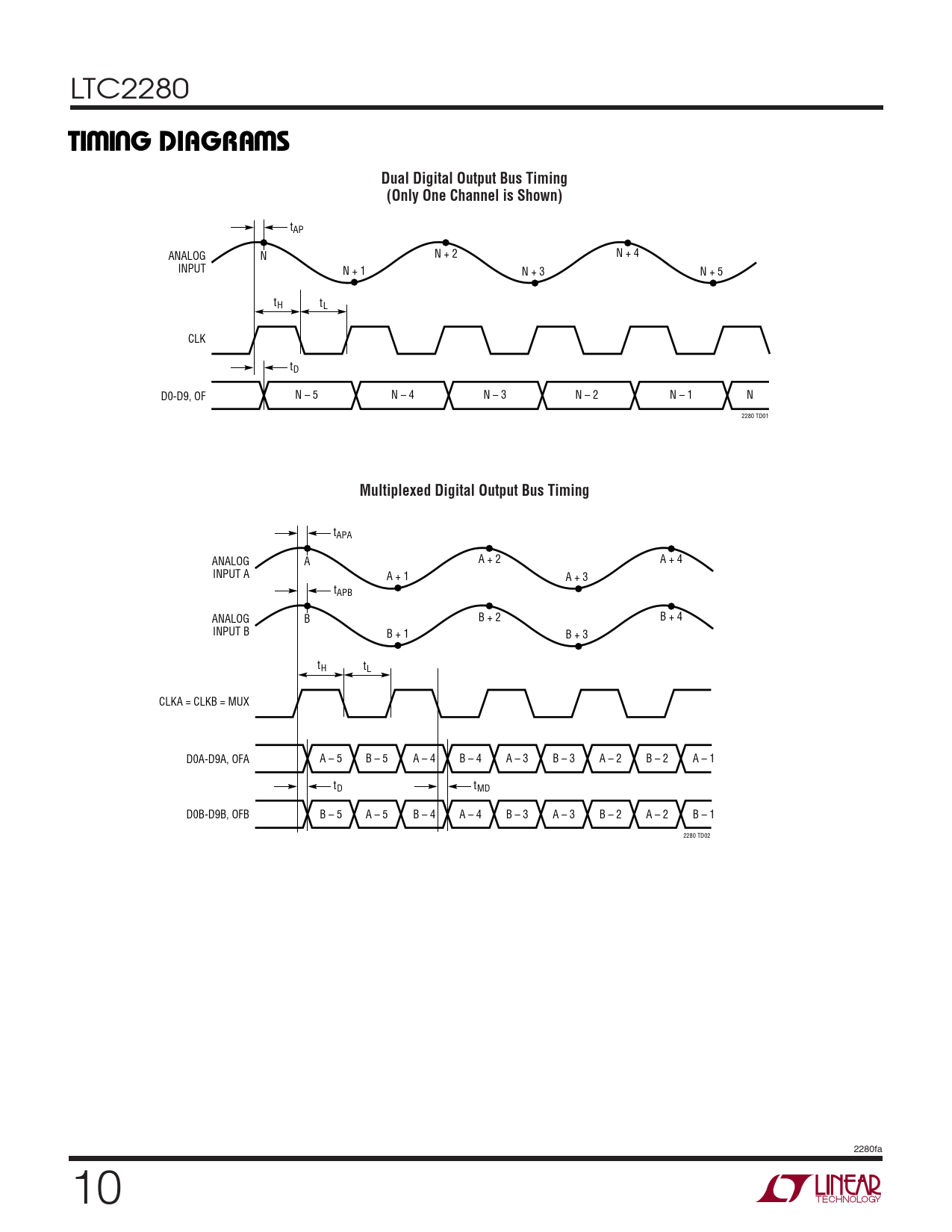 tAP N + 2 N + 4 ANALOG N INPUT N + 1 N + 3 N + 5 tH tL CLK tD D0-D9, OF N – 5 N – 4 N – 3 N – 2 N – 1 N 2280 TD01