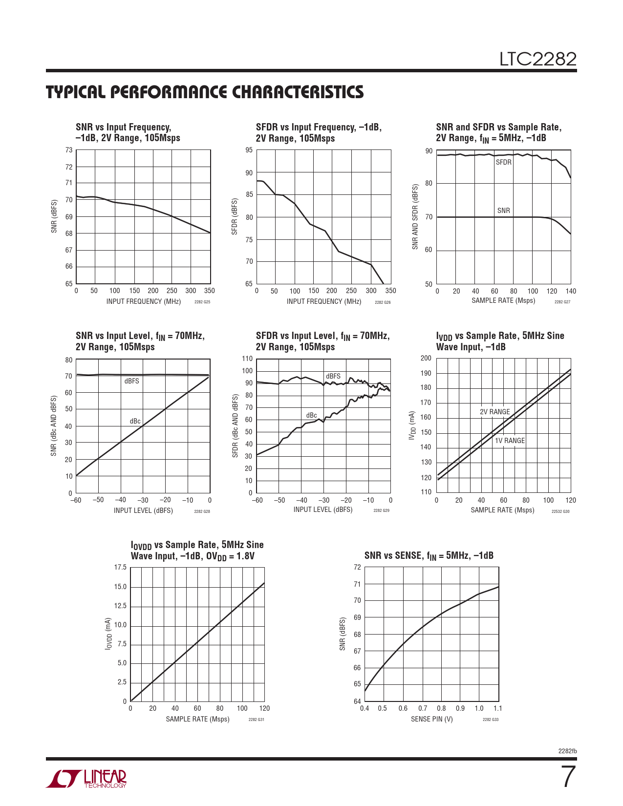 73 95 90 SFDR 72 90 71 80 85 70 SNR 69 80 70 SNR (dBFS) 68 SFDR (dBFS) 75 SNR AND SFDR (dBFS) 67 60 70 66 65 65 50 0 50 100 150 200 250 300 350 0 50 100 150 200 250 300 350 0 20 40 60 80 100 120 140 INPUT FREQUENCY (MHz) 2282 G25 INPUT FREQUENCY (MHz) 2282 G26 SAMPLE RATE (Msps) 2282 G27