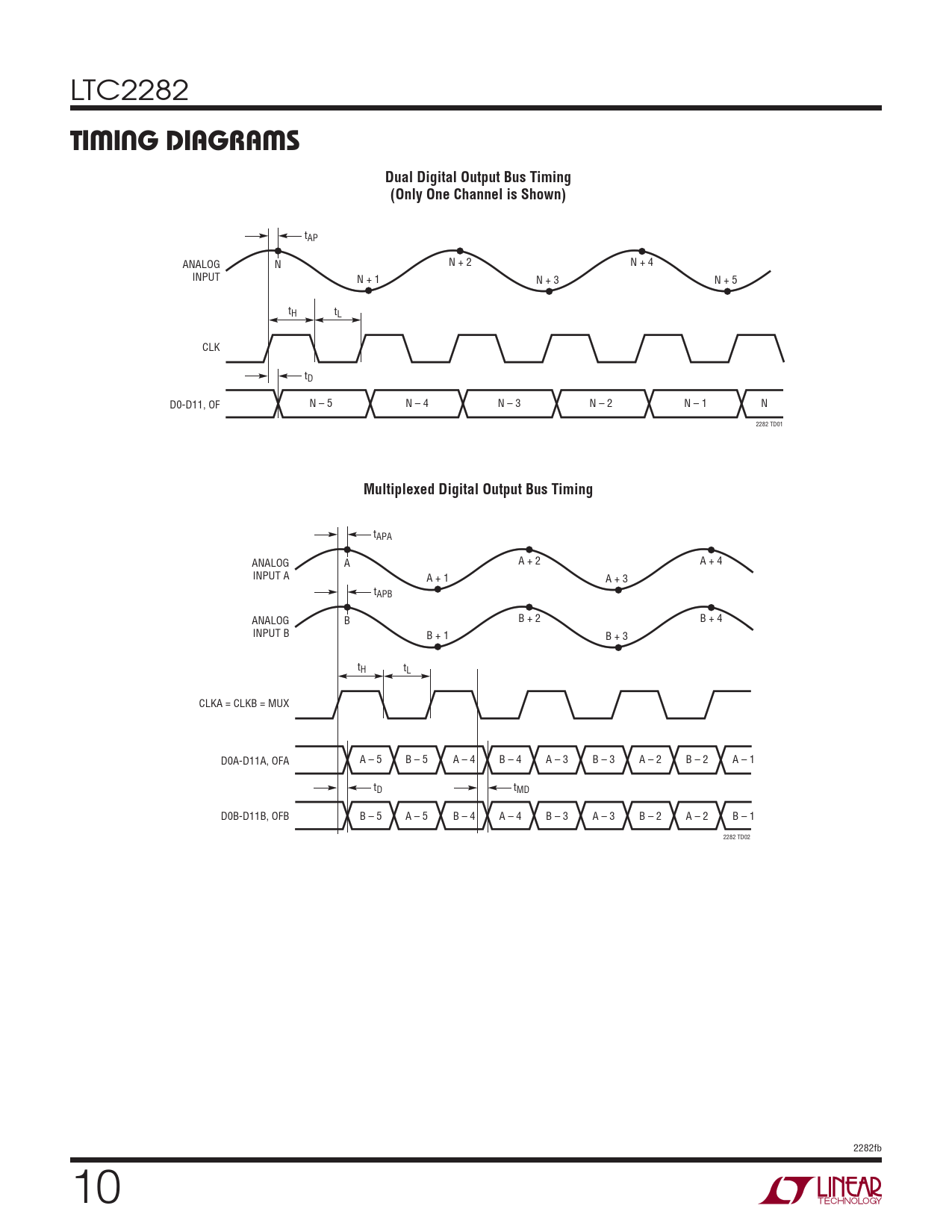 LTC2282 TIMING DIAGRAMSDual Digital Output Bus Timing(Only One Channel is Shown) tAP N + 2 N + 4 ANALOG N INPUT N + 1 N + 3 N + 5 tH tL CLK tD D0-D11, OF N – 5 N – 4 N – 3 N – 2 N – 1 N 2282 TD01 Multiplexed Digital Output Bus Timing tAPA A + 2 A + 4 ANALOG A INPUT A A + 1 A + 3 tAPB B + 2 B + 4 ANALOG B INPUT B B + 1 B + 3 tH tL CLKA = CLKB = MUX D0A-D11A, OFA A – 5 B – 5 A – 4 B – 4 A – 3 B – 3 A – 2 B – 2 A – 1 tD tMD D0B-D11B, OFB B – 5 A – 5 B – 4 A – 4 B – 3 A – 3 B – 2 A – 2 B – 1 2282 TD02 2282fb 10