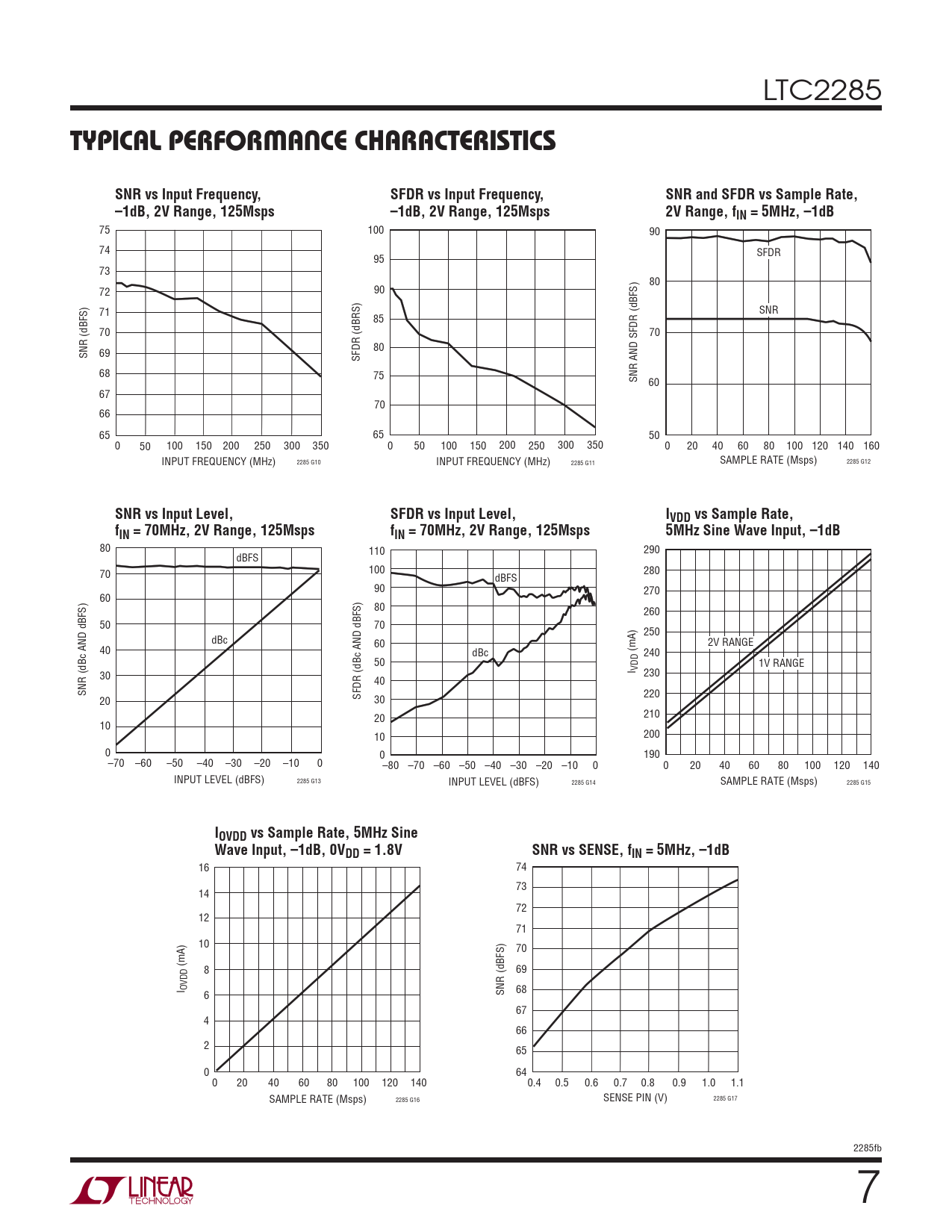 80 110 290 dBFS 70 100 280 dBFS 90 270 60 80 260 50 70 250 dBc 60 2V RANGE 40 dBc (mA) 240 50 1V RANGE I VDD 30 230 40 SNR (dBc AND dBFS) SFDR (dBc AND dBFS) 220 20 30 20 210 10 10 200 0 0 190 –70 –60 –50 –40 –30 –20 –10 0 –80 –70 –60 –50 –40 –30 –20 –10 0 0 20 40 60 80 100 120 140 INPUT LEVEL (dBFS) 2285 G13 INPUT LEVEL (dBFS) 2285 G14 SAMPLE RATE (Msps) 2285 G15