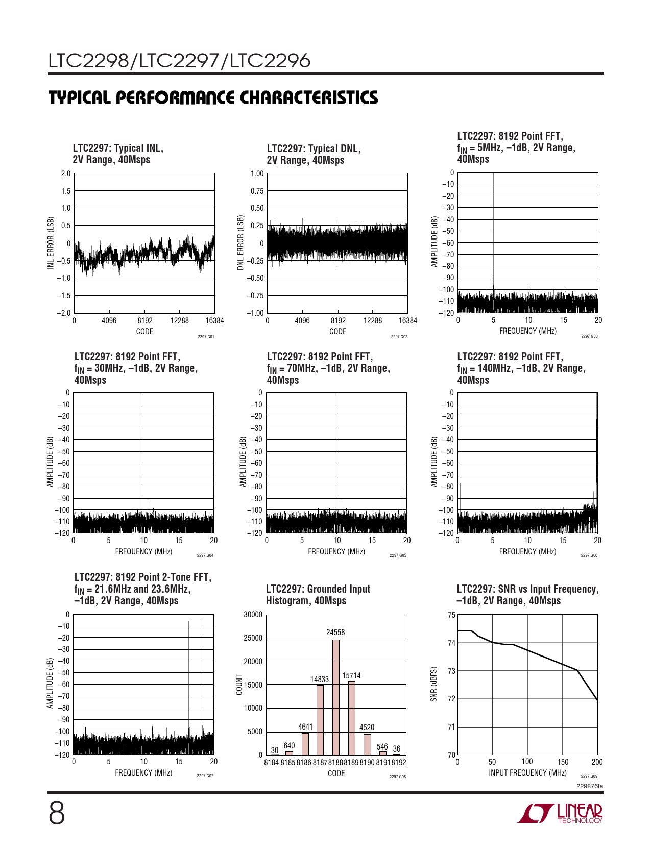 W U TYPICAL PERFOR A CE CHARACTERISTICS LTC2297: 8192 Point FFT, LTC2297: Typical INL, LTC2297: Typical DNL, fIN = 5MHz, –1dB, 2V Range, 2V Range, 40Msps 2V Range, 40Msps 40Msps