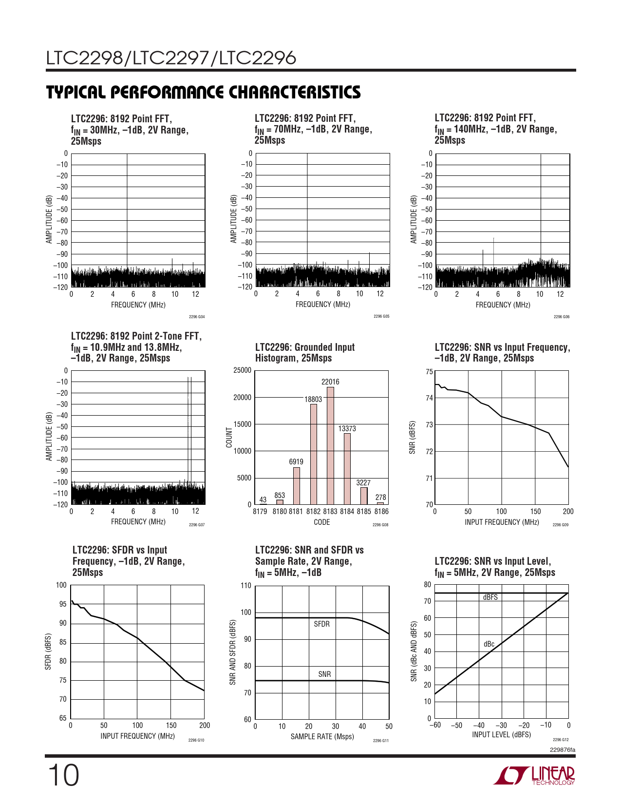 100 110 80 dBFS 95 70 100 60 90 SFDR 50 85 90 dBc 40 80 SFDR (dBFS) 80 30 SNR 75 SNR (dBc AND dBFS) SNR AND SFDR (dBFS) 20 70 70 10 65 60 0 0 50 100 150 200 0 10 20 30 40 50 –60 –50 –40 –30 –20 –10 0 INPUT FREQUENCY (MHz) SAMPLE RATE (Msps) INPUT LEVEL (dBFS) 2296 G10 2296 G11 2296 G12 229876fa 10