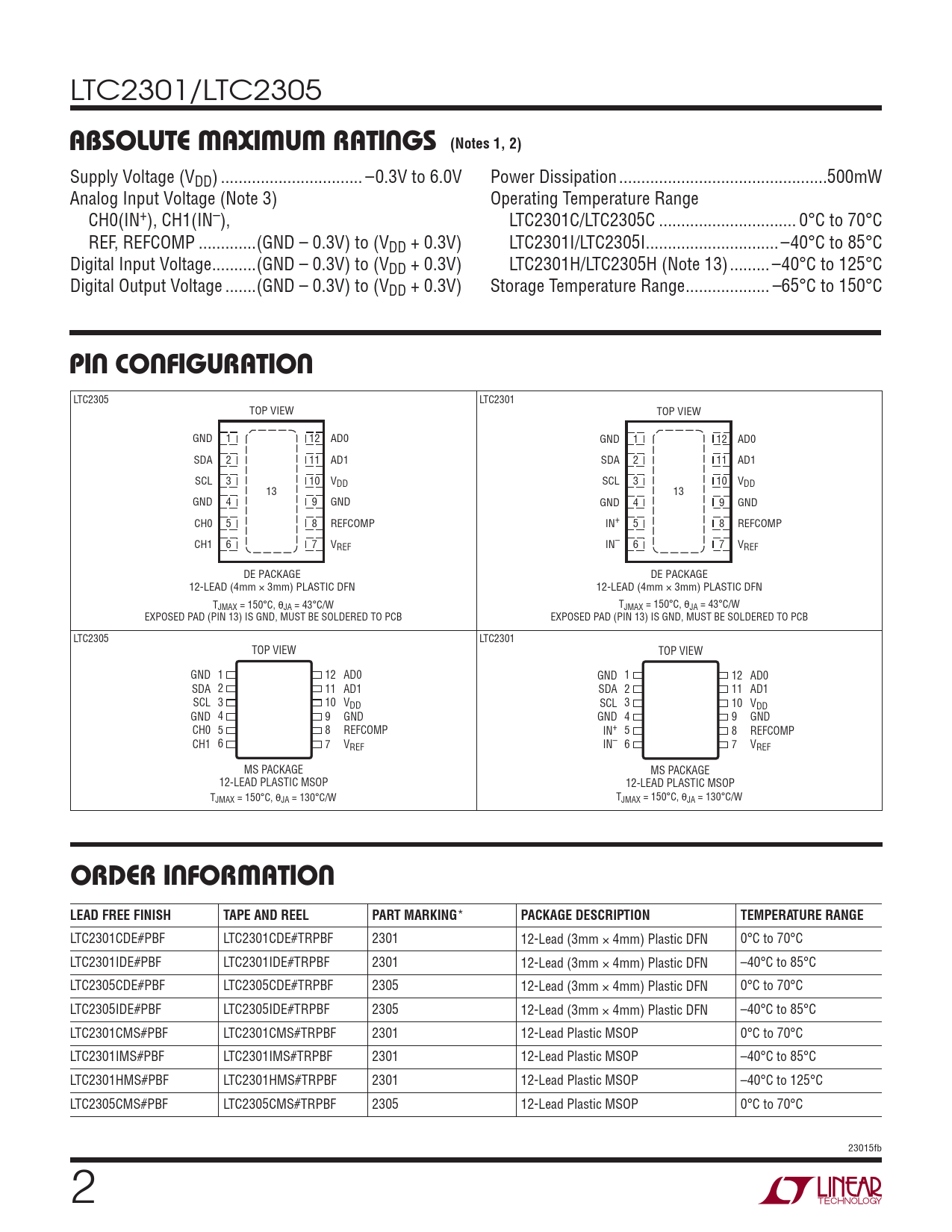 LTC2301CDE#PBF LTC2301CDE#TRPBF 2301 12-Lead (3mm × 4mm) Plastic DFN 0°C to 70°C LTC2301IDE#PBF LTC2301IDE#TRPBF 2301 12-Lead (3mm × 4mm) Plastic DFN –40°C to 85°C LTC2305CDE#PBF LTC2305CDE#TRPBF 2305 12-Lead (3mm × 4mm) Plastic DFN 0°C to 70°C LTC2305IDE#PBF LTC2305IDE#TRPBF 2305 12-Lead (3mm × 4mm) Plastic DFN –40°C to 85°C LTC2301CMS#PBF LTC2301CMS#TRPBF 2301 12-Lead Plastic MSOP 0°C to 70°C LTC2301IMS#PBF LTC2301IMS#TRPBF 2301 12-Lead Plastic MSOP –40°C to 85°C LTC2301HMS#PBF LTC2301HMS#TRPBF 2301 12-Lead Plastic MSOP –40°C to 125°C LTC2305CMS#PBF LTC2305CMS#TRPBF 2305 12-Lead Plastic MSOP 0°C to 70°C 23015fb 2