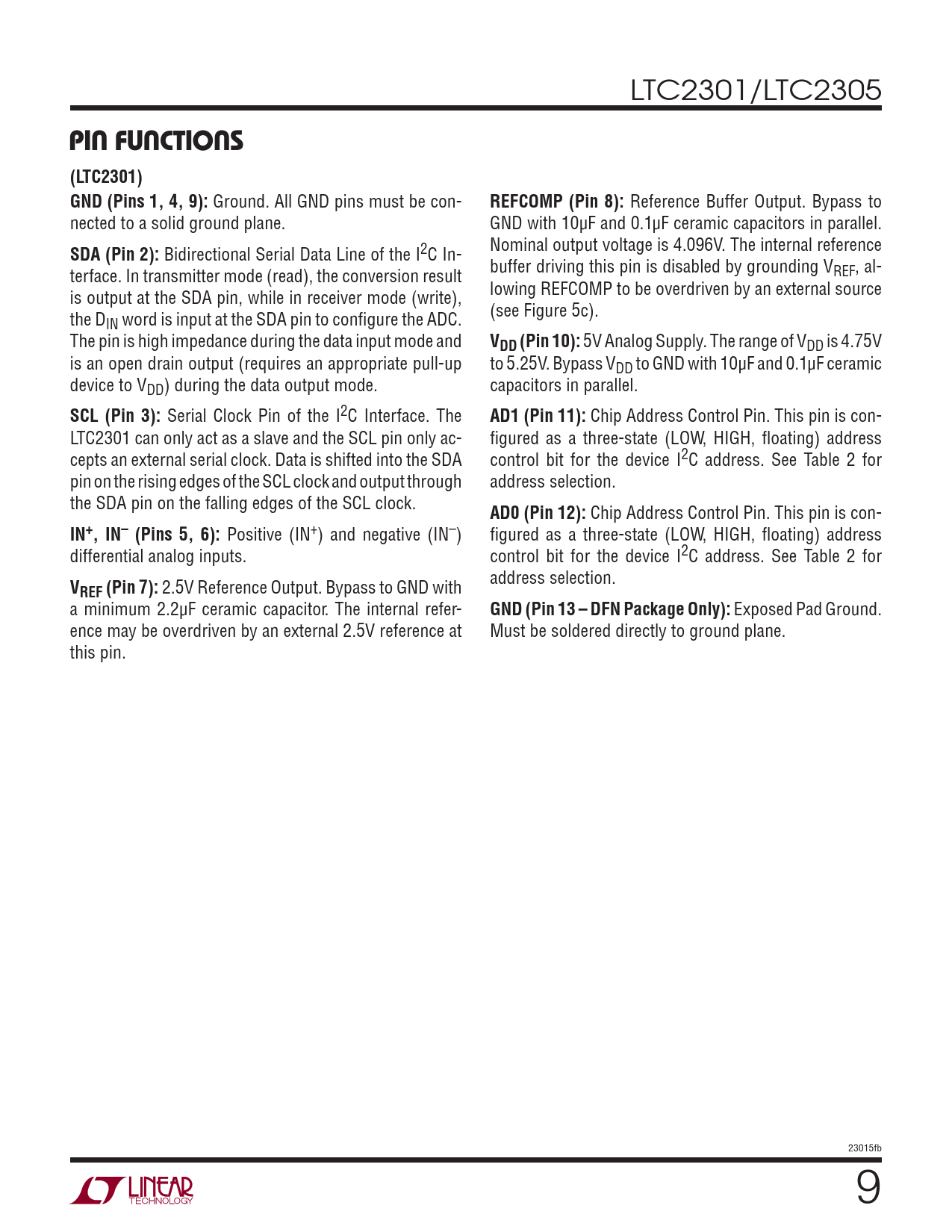 LTC2301/LTC2305 PIN FUNCTIONS(LTC2301) GND (Pins 1, 4, 9): Ground. All GND pins must be con- REFCOMP (Pin 8): Reference Buffer Output. Bypass to nected to a solid ground plane. GND with 10μF and 0.1μF ceramic capacitors in parallel. Nominal output voltage is 4.096V. The internal reference SDA (Pin 2): Bidirectional Serial Data Line of the I2C In- buffer driving this pin is disabled by grounding V terface. In transmitter mode (read), the conversion result REF, al- lowing REFCOMP to be overdriven by an external source is output at the SDA pin, while in receiver mode (write), (see Figure 5c). the DIN word is input at the SDA pin to confi gure the ADC. The pin is high impedance during the data input mode and VDD (Pin 10): 5V Analog Supply. The range of VDD is 4.75V is an open drain output (requires an appropriate pull-up to 5.25V. Bypass VDD to GND with 10μF and 0.1μF ceramic device to VDD) during the data output mode. capacitors in parallel. SCL (Pin 3): Serial Clock Pin of the I2C Interface. The AD1 (Pin 11): Chip Address Control Pin. This pin is con- LTC2301 can only act as a slave and the SCL pin only ac- fi gured as a three-state (LOW, HIGH, fl oating) address cepts an external serial clock. Data is shifted into the SDA control bit for the device I2C address. See Table 2 for pin on the rising edges of the SCL clock and output through address selection. the SDA pin on the falling edges of the SCL clock. AD0 (Pin 12): Chip Address Control Pin. This pin is con- IN+, IN– (Pins 5, 6): Positive (IN+) and negative (IN–) fi gured as a three-state (LOW, HIGH, fl oating) address differential analog inputs. control bit for the device I2C address. See Table 2 for address selection. VREF (Pin 7): 2.5V Reference Output. Bypass to GND with a minimum 2.2μF ceramic capacitor. The internal refer- GND (Pin 13 – DFN Package Only): Exposed Pad Ground. ence may be overdriven by an external 2.5V reference at Must be soldered directly to ground plane. this pin. 23015fb 9